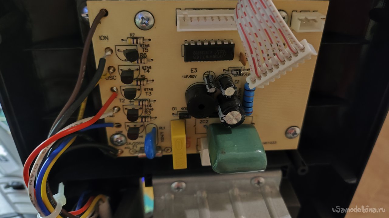 Поставил на место и прикрутил подставку, с вертикально стоящим вентилятором будет проще работать. Приступаем к изучению схемы управления. Симисторы сверху вниз отвечают за ионизацию, осцилляцию (поворот), три скорости вращения вентилятора. Может какой-то симистор пробит, и это вызывает срабатывание токовой защиты? Включил вилку в сеть, проверил предположение. В выключенном состоянии на обмотки напряжение не приходит.