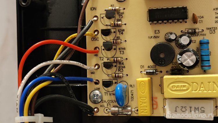 Желтый и красный провода идут на двигатель, отвечающий за поворот (осцилляцию) вентилятора.