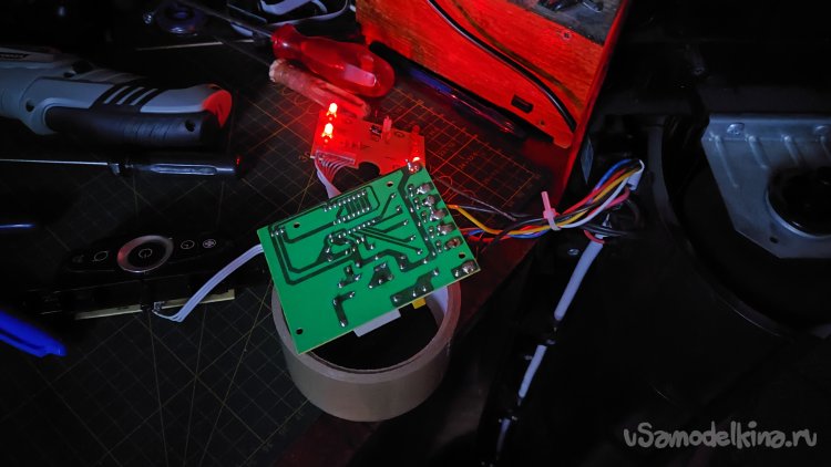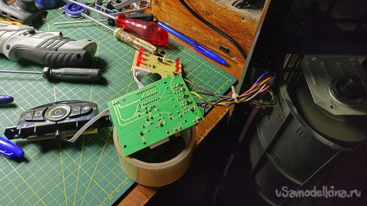 Снял основную плату вместе с кнопками управления. Плата повисла высоко, на стол не ложится. Не беда, подложил рулон скотча.