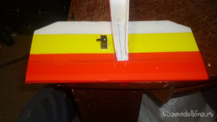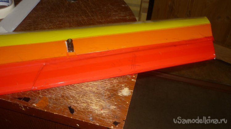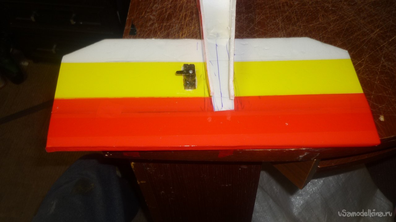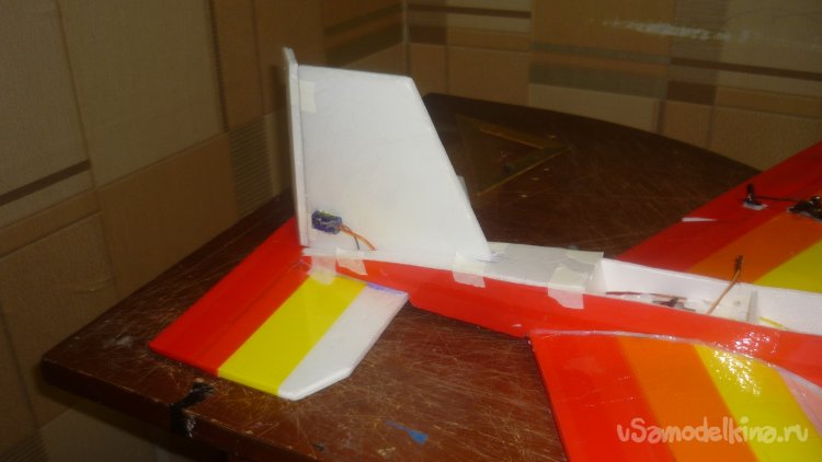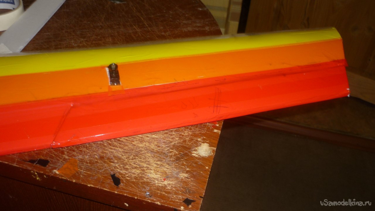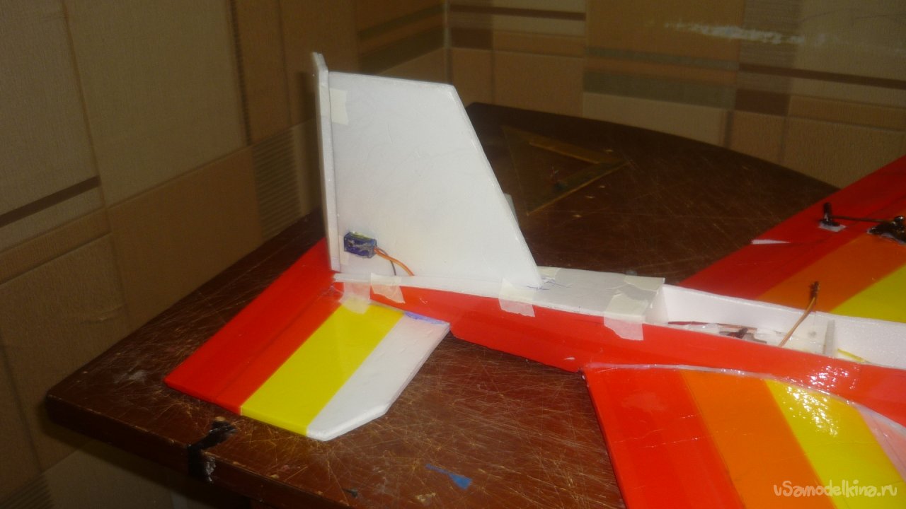 Навесил руль направления на киль. Навешивал на бумажный, малярный скотч.