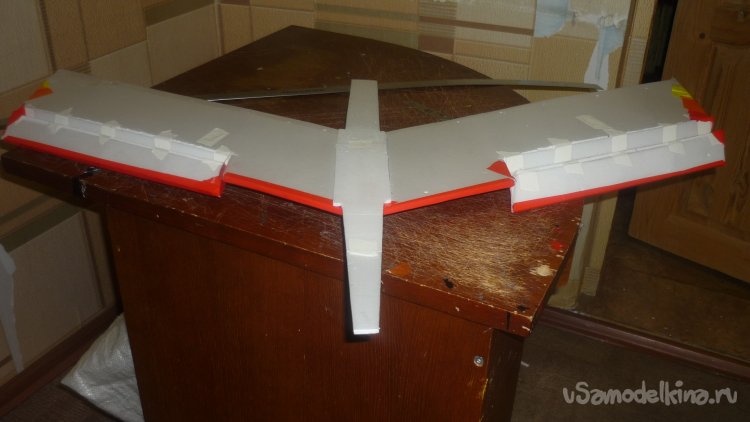 е В боковых стенках фюзеляжа делаю фасонные вырезы под крылья и обтягиваю цветным скотчем..