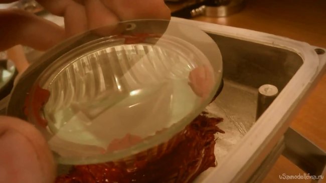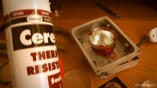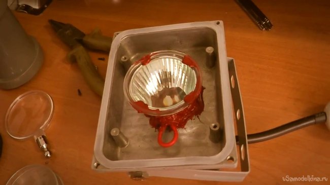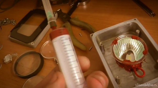 Теперь можно приступить к изготовлению проектора. Для большего удобства работы можно набрать необходимое количество герметика в шприц. Разбираем прожектор, снимаем все лишнее, и осторожно герметиком приклеиваем отражатель к корпусу.