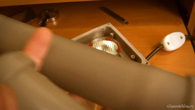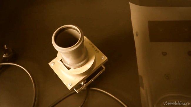 Поверх рефлектора надеваем муфту, а в нее вставляем канализационную трубу. Нужно проследить, чтобы диаметр трубы соответствовал диаметру 50-миллиметровых линз.