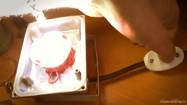 Лишним в данном случае является лампа накаливания, которую нужно снять в первую очередь. Когда рефлектор прикреплен, нужно позаботиться о линзе, которая будет собирать свет. Автор использует десятикратную линзу, которая приклеена к рефлектору или отражателю. Однако поверх нее также нужно приклеить трехкратную линзу для лучшего эффекта.