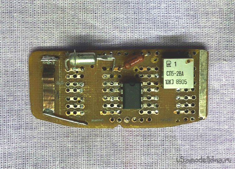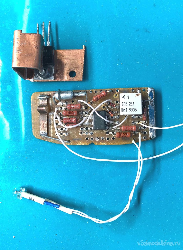 Схему зарядного устройства соберем на отрезке универсальной монтажной платы и установим ее в центральный отсек подставки. Габариты платы определим по внутренним размерам отсека. Оптимально расположим и установим крупные ведущие детали схемы – микросхему операционного усилителя, стабистор, потенциометр R2, ограничительный резистор R10 (изготовлен из шунта от старого амперметра).