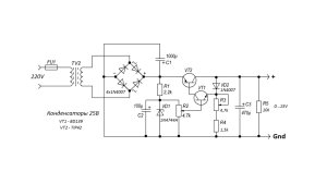 Изменившееся выходное напряжение поступает на затвор (G) полевого транзистора VT1 и соответственно изменяет (корректирует) проходящий через транзистор ток, стабилизируя его.