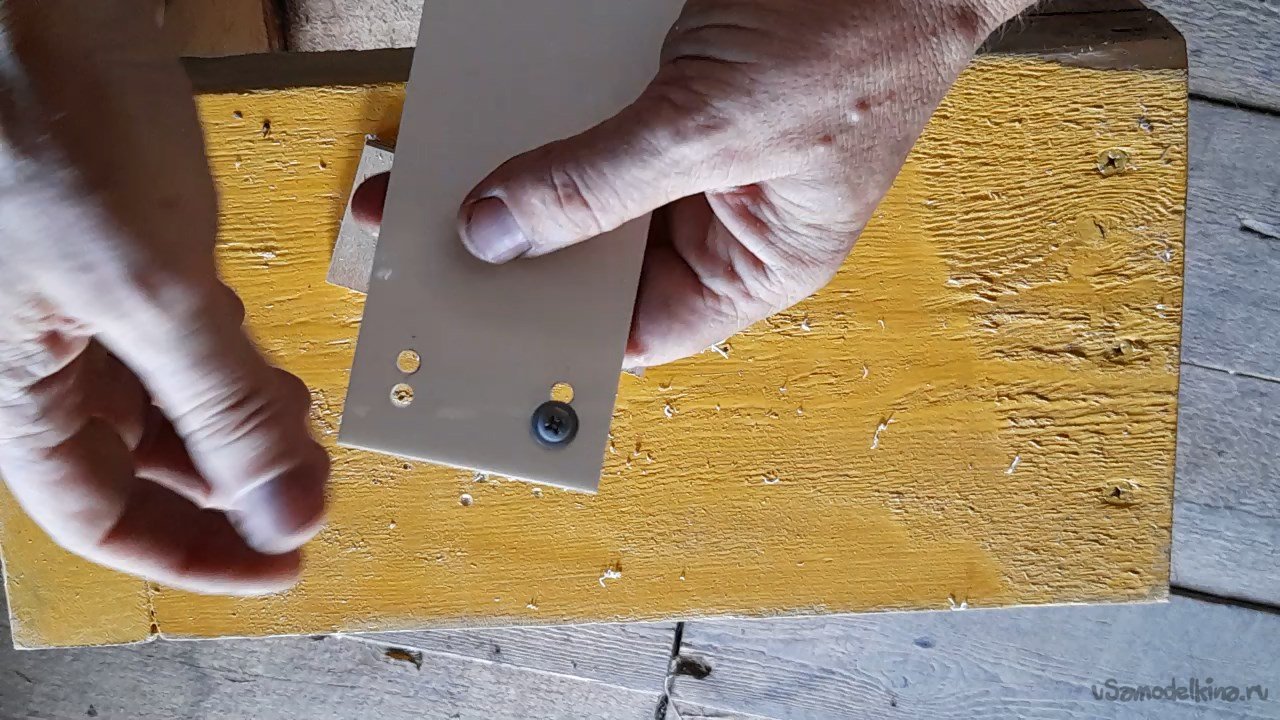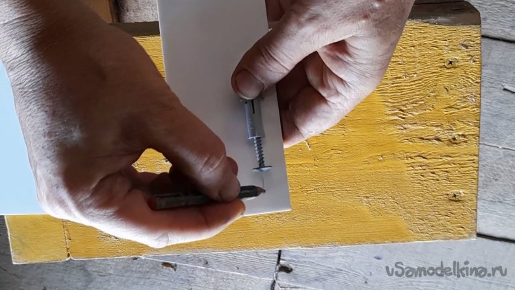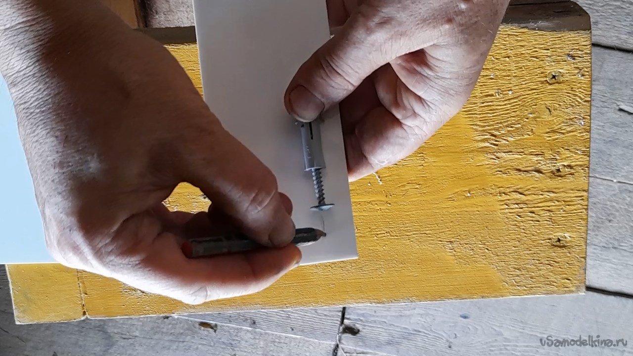Я прикладываю головки анкерных шурупов к пластиковой заготовке и помечаю карандашом точки высверливания.