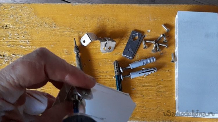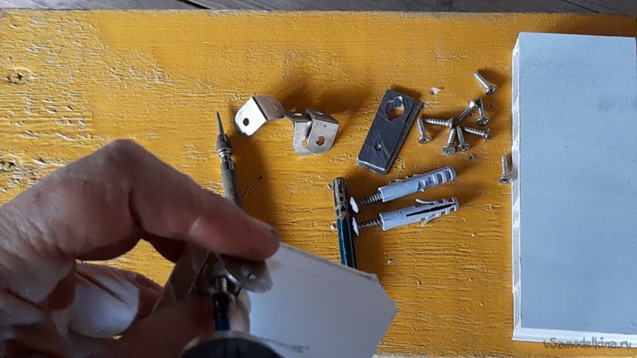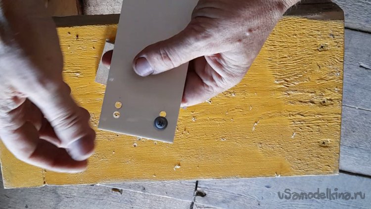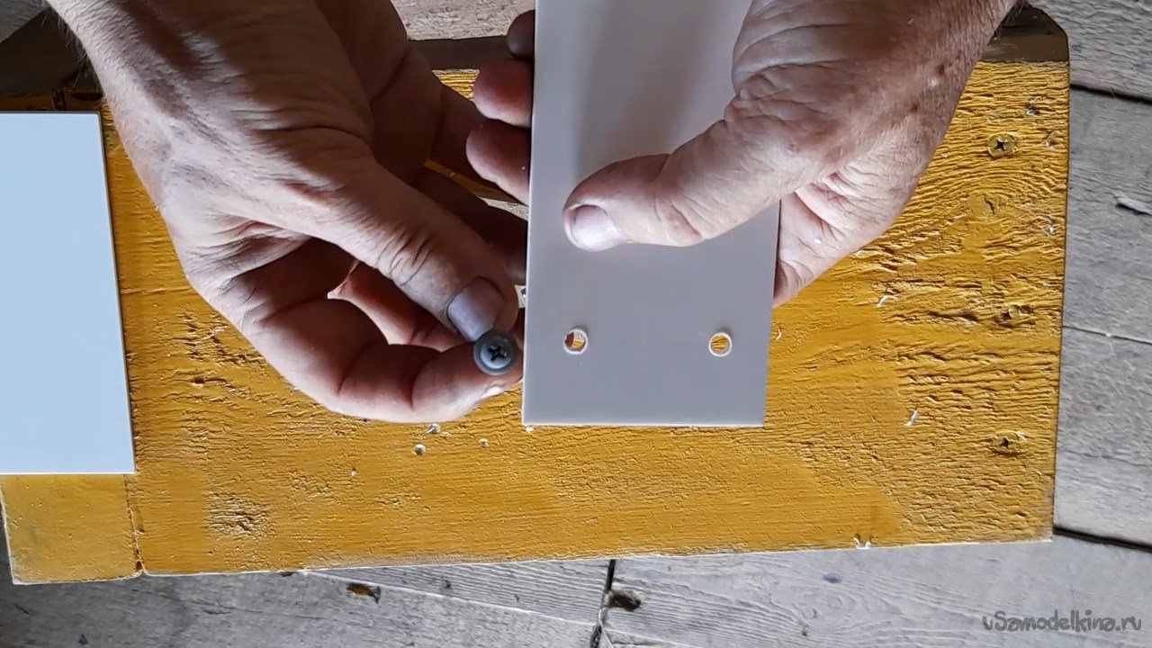 Делаю по одному отступу от каждого высверленного отверстия ближе к краю пластиковой заготовки на 5 мм, помечаю и высверливаю еще два отверстия, при этом необходимый диаметр отверстий должен быть немного более диаметра анкерного шурупа.