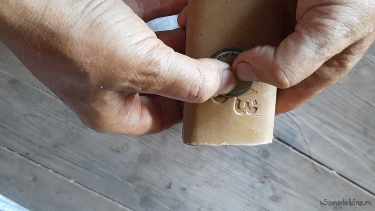Берем пробку, располагаем по центру и вдавливаем со всей силы равномерно, чтобы пробка была вдавлена ровно параллельно поверхности мыла, а не криво по диагонали.