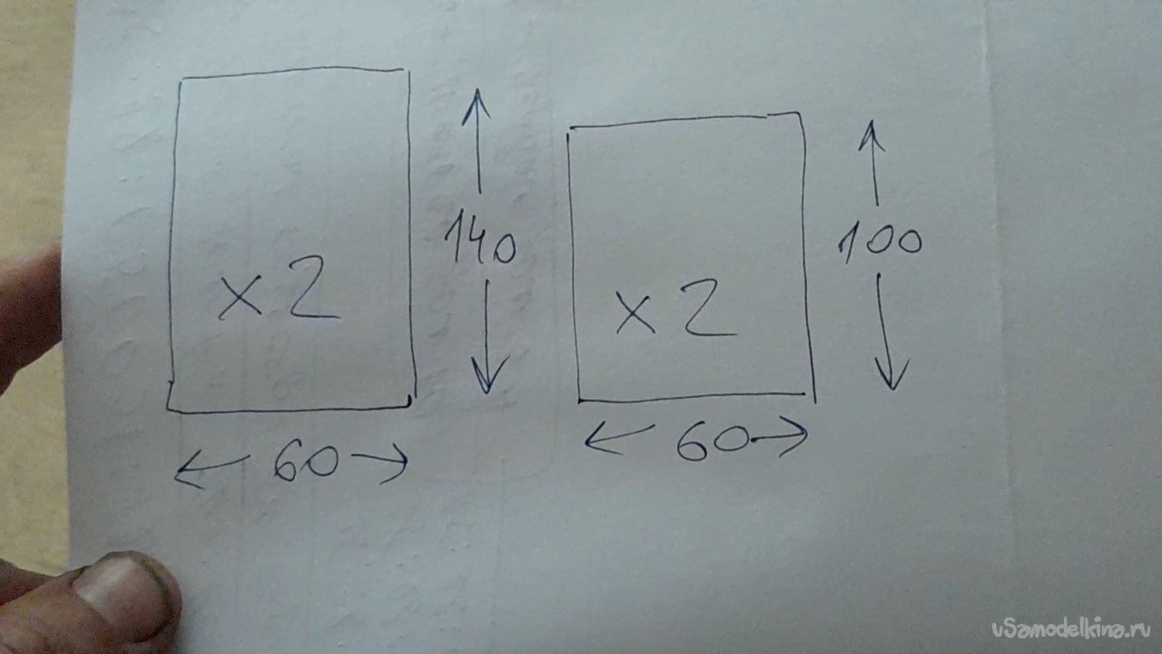 При помощи линейки и угольника отмечаю контуры будущих четырех заготовок размерами 140 на 60, и 100 на 60 мм.