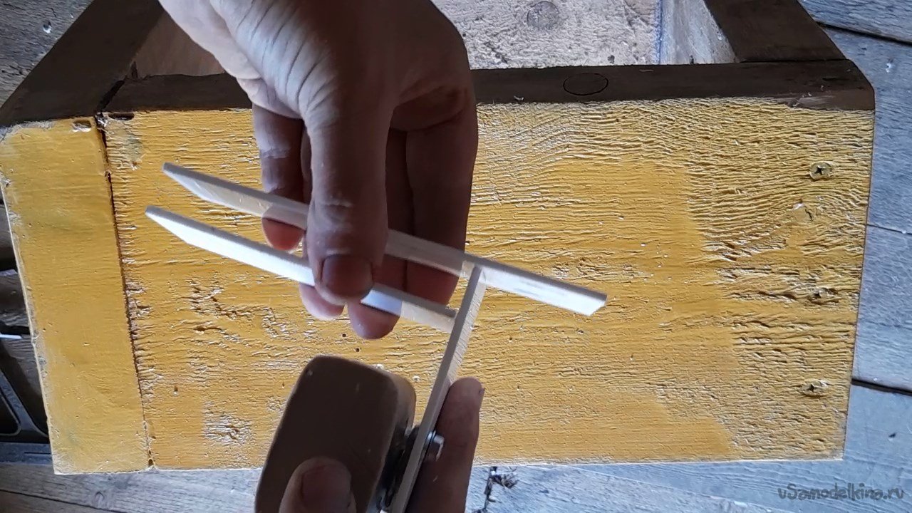 Теперь надо выпилить и приклеить между опорной и задней стенкой конструкции две боковые стенки.