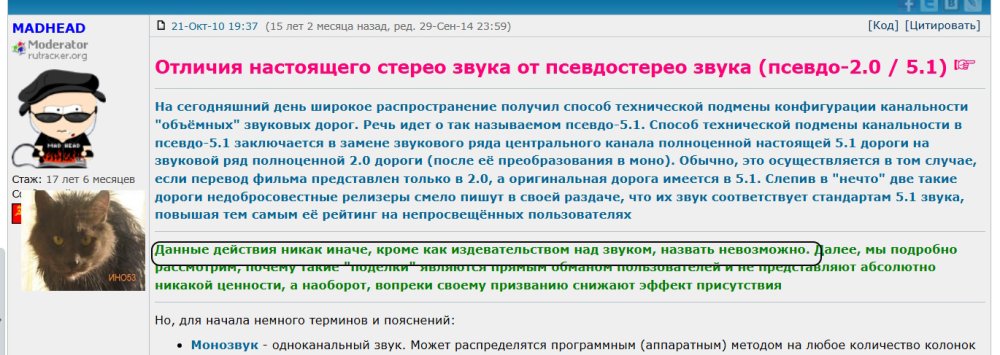 Это вы все можете спокойно слушать музыку, если даже какой-то инструмент чуток фальшивит!! Я же, слыша все отдельные партии и явственно их разделяя, сразу "спотыкаюсь" об косячащую партию!!! Потому и "псевдостерео" мне не заходит! Я же слышу в одном ухе ту-же партию, что и в другом, только "как через вату", в то время, как остальные - или звучат нормально, или "вывернуты наоборот".)))
