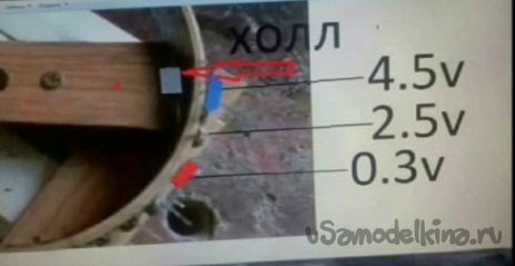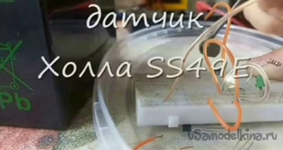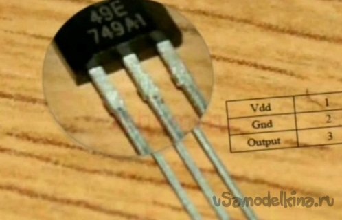 Взял датчик Холла ss49Е, такой устанавливают в ручку газа электротранспорта. Работа этого Холла интересная, когда он подключен к питанию, на выходе у него примерно сразу три вольта. Когда на него воздействовать одним магнитным полюсом, напряжение падает примерно до ноль целых четыре десятых вольта, если другим, подымается примерно до четыре и шесть десятых вольта.