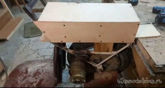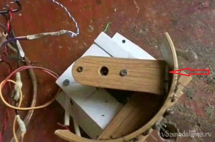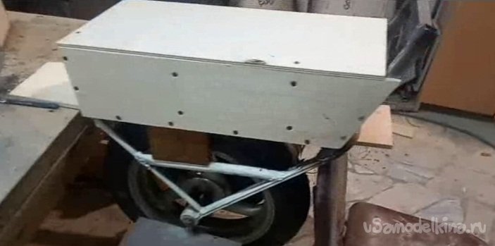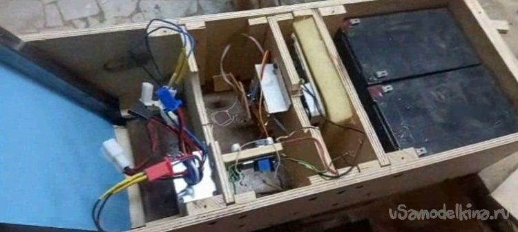 . Конструкцию колеса слегка изменил для удобного размещения аккумуляторов и электроники. Над колесом приварил металлический лист, на котором собрал корпус с отсеком для аккумуляторы и тремя выдвижными пластинами из фанеры. На первой пластине, на поролоновой подкладке закрепил «электронные мозги», так смягчится микро вибрация при движении работе двигателя. На второй, исполняющий серво блок и преобразователь напряжения для питания электроники. На третьей, реле и контроллер. Каждая пластина отключается от общей схемы разъёмами, для удобства ремонта при необходимости.