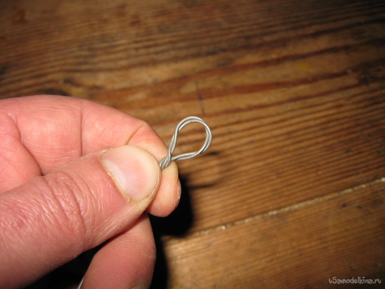 Этот поводок я сделал из стальной оцинкованной проволоки диаметром 1,2 мм, скрученной вдвое. На свободном конце этого поводка, сделал петельку диаметром 8 мм, для крепления к деревянной рукоятке.