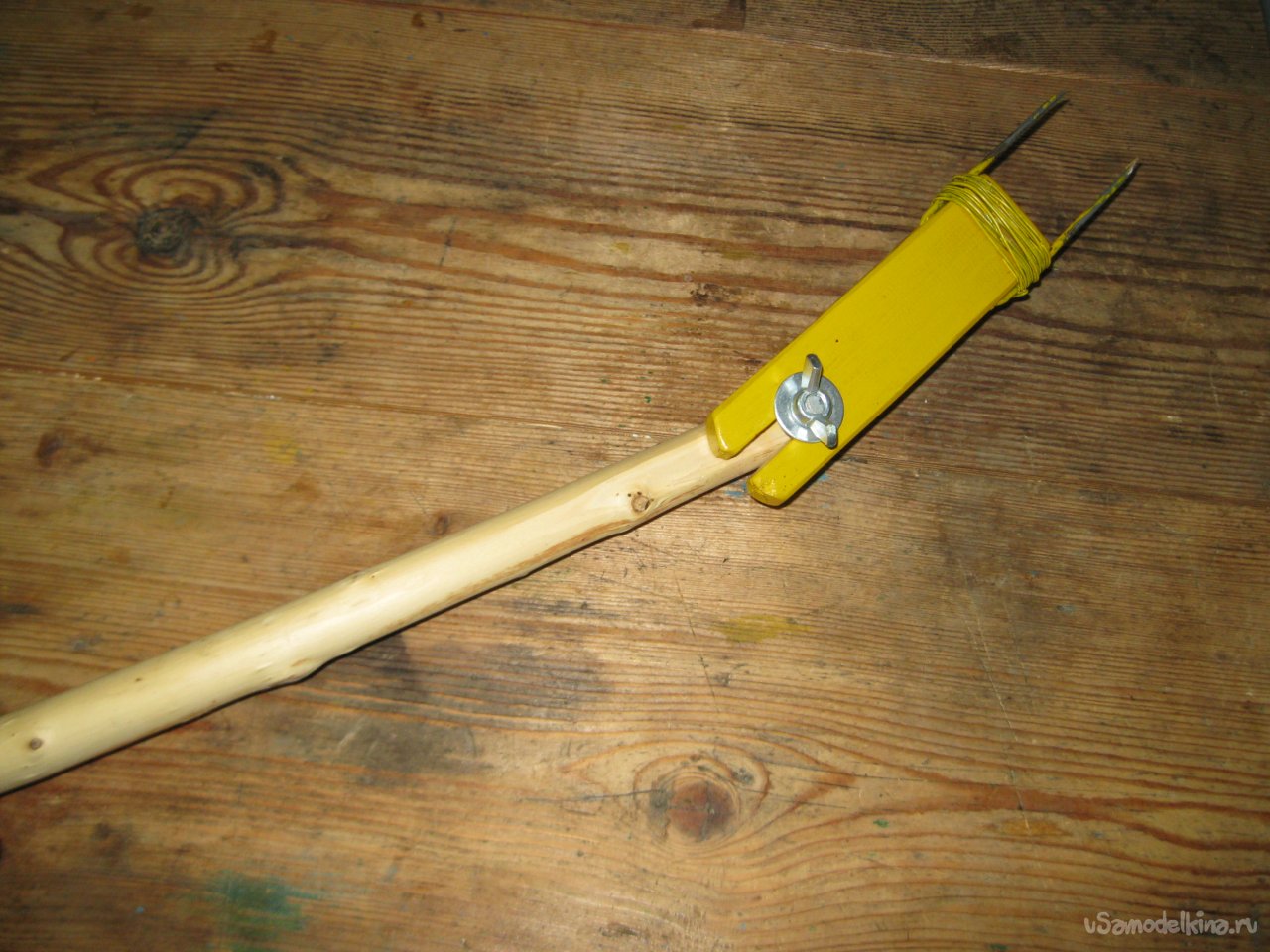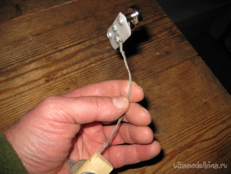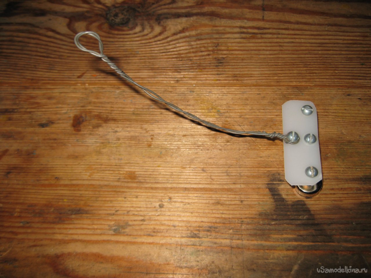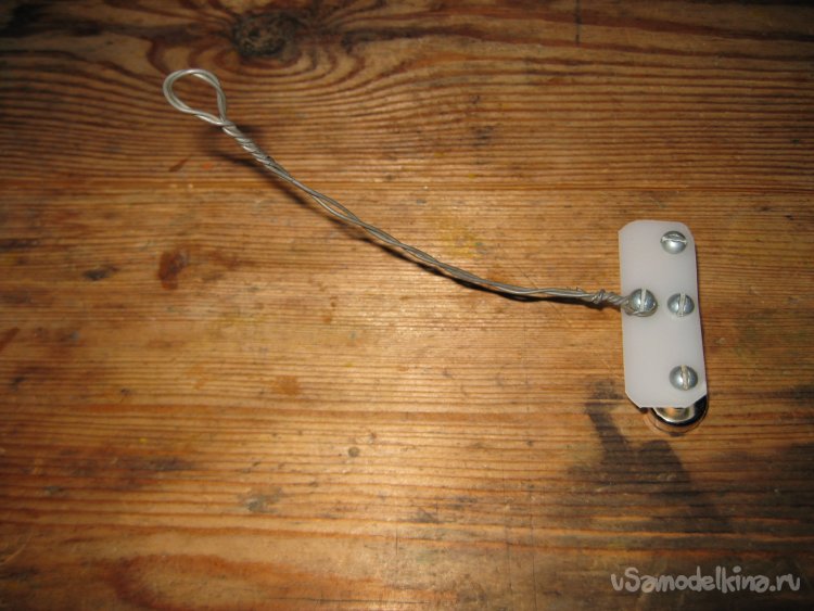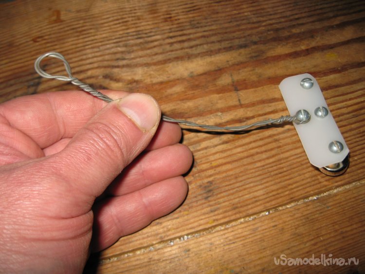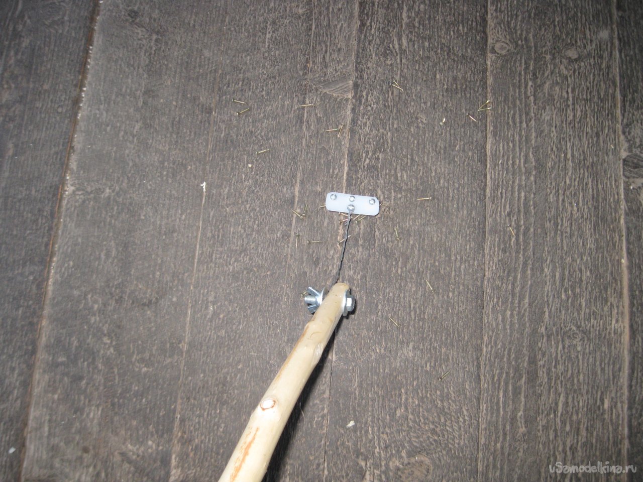 А с противоположной стороны пластинки, прикрепил проволочный поводок, для дальнейшего крепления данного приспособления к рукоятке.