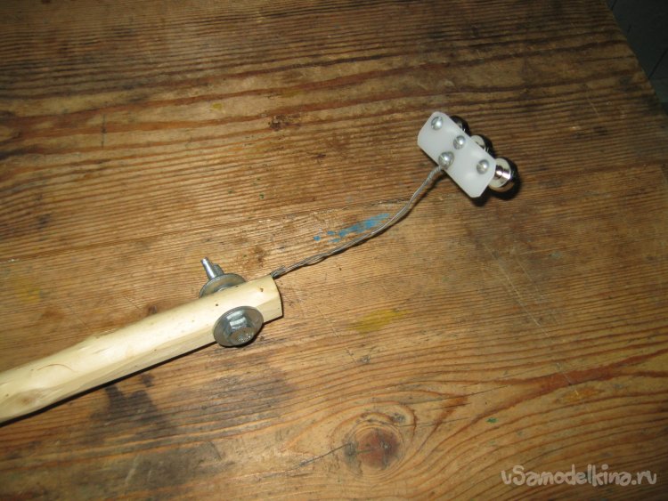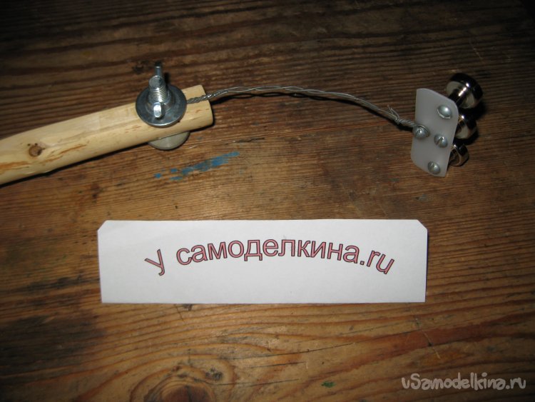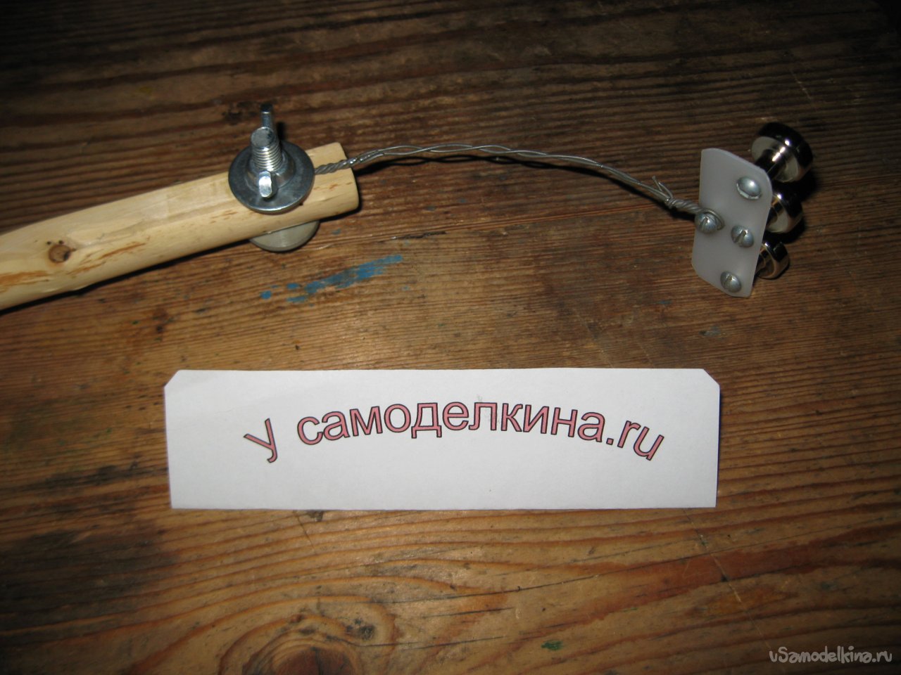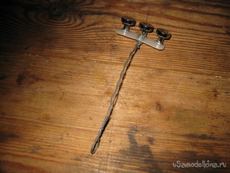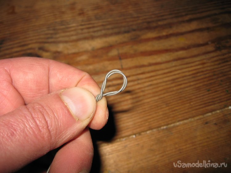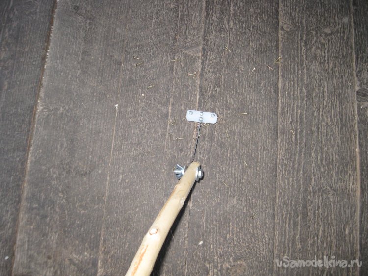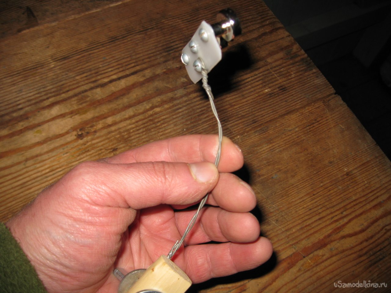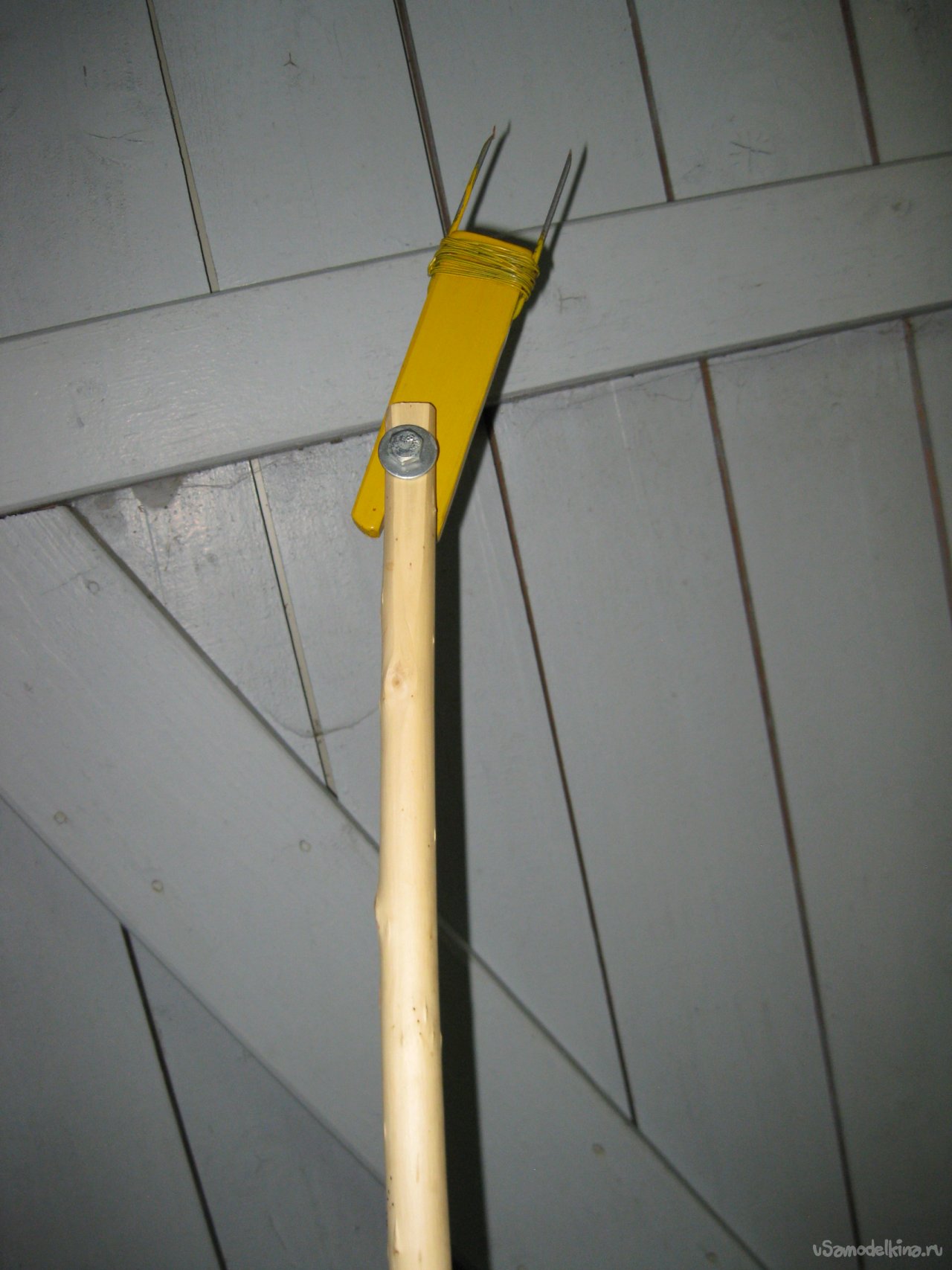 А с противоположной стороны пластинки, прикрепил проволочный поводок, для дальнейшего крепления данного приспособления к рукоятке.