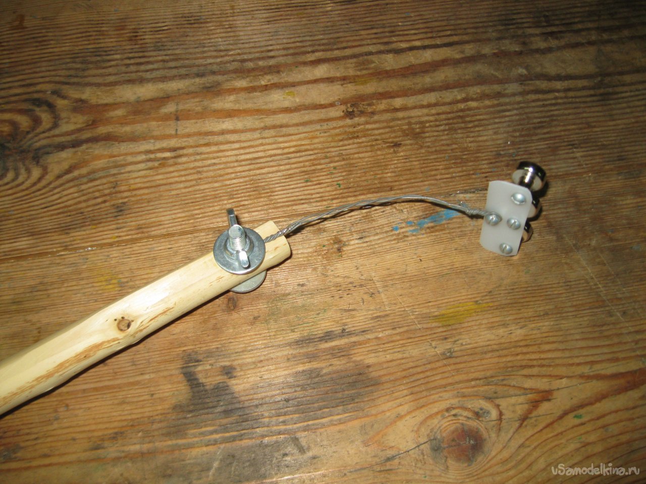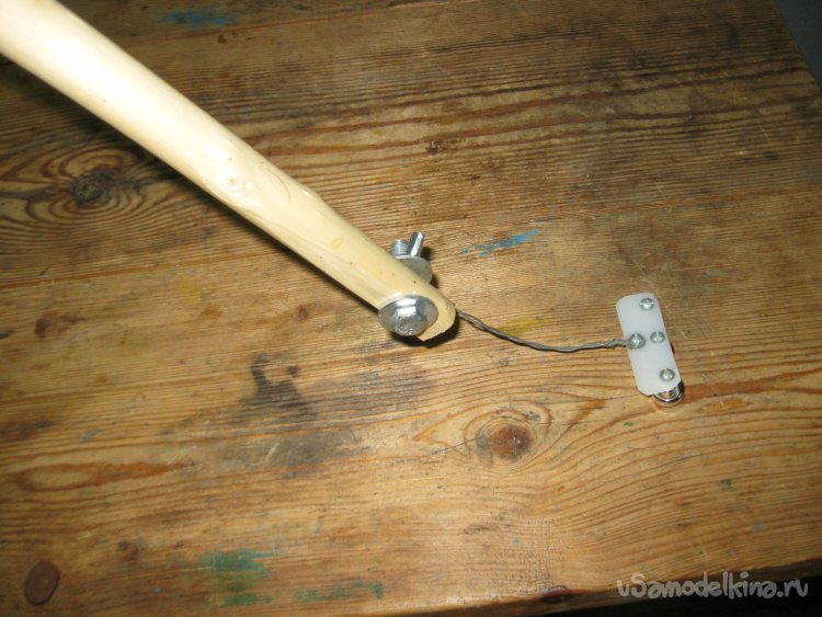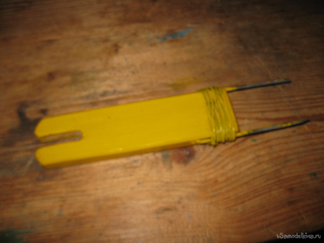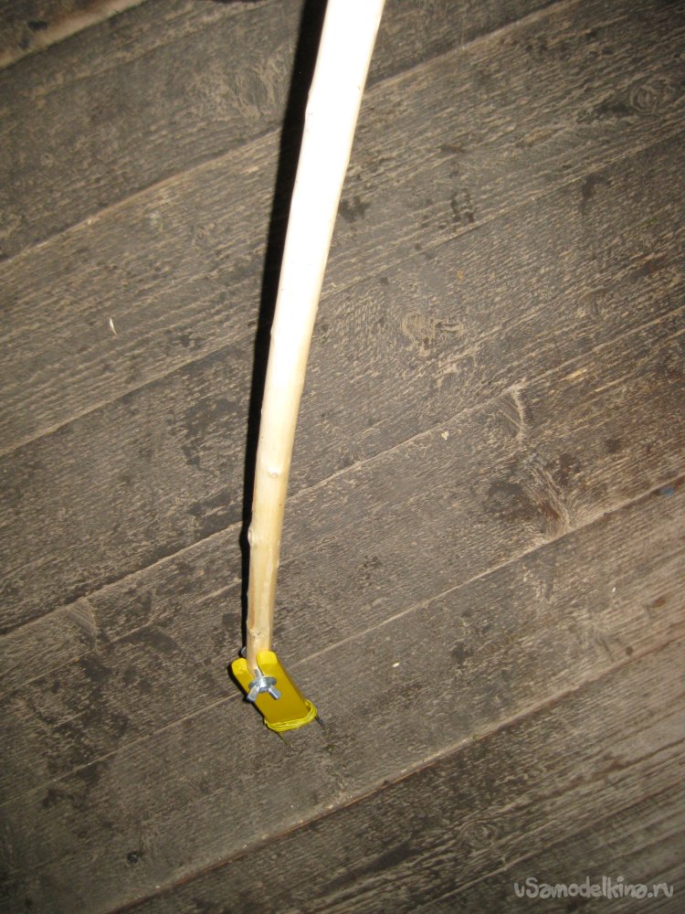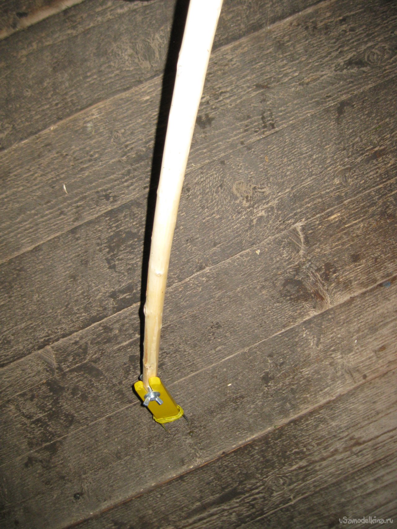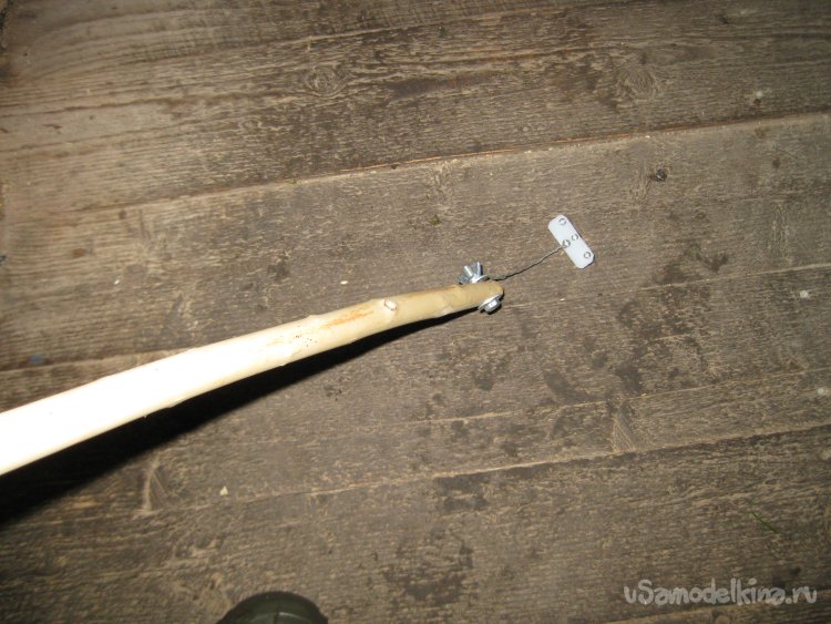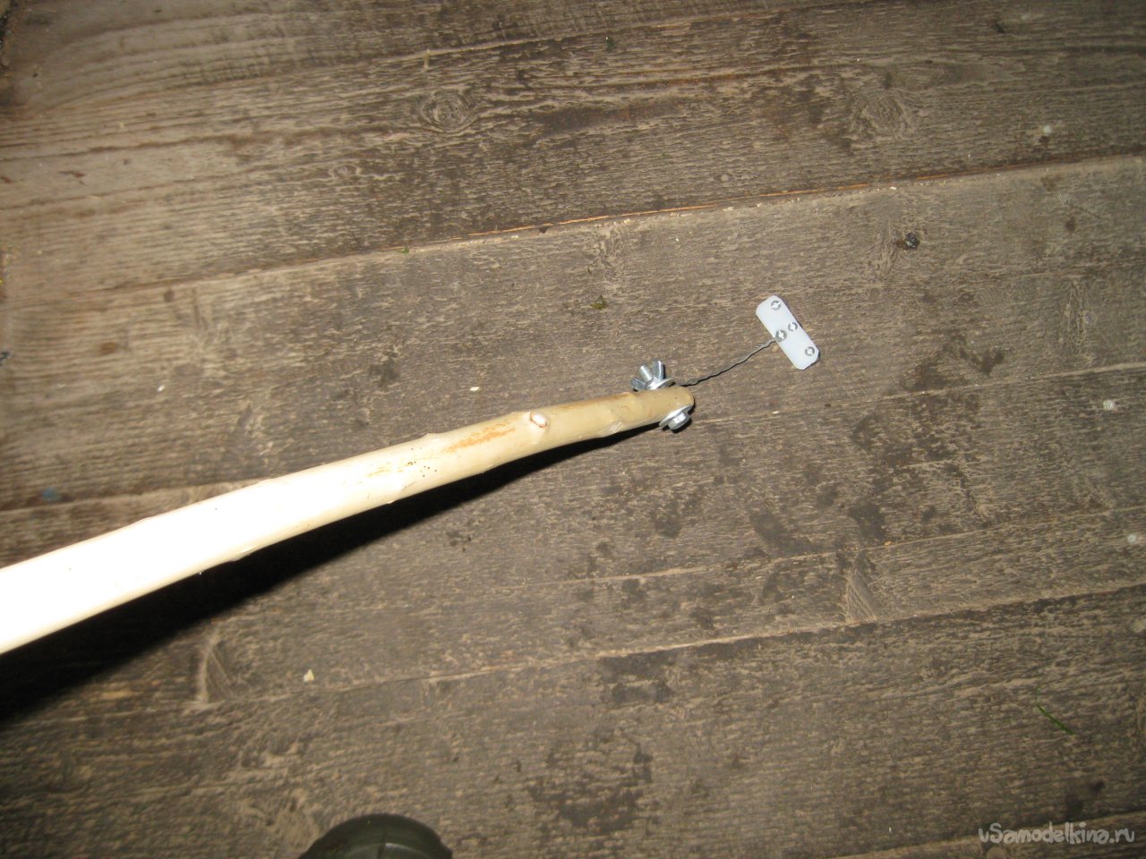 А с противоположной стороны пластинки, прикрепил проволочный поводок, для дальнейшего крепления данного приспособления к рукоятке.