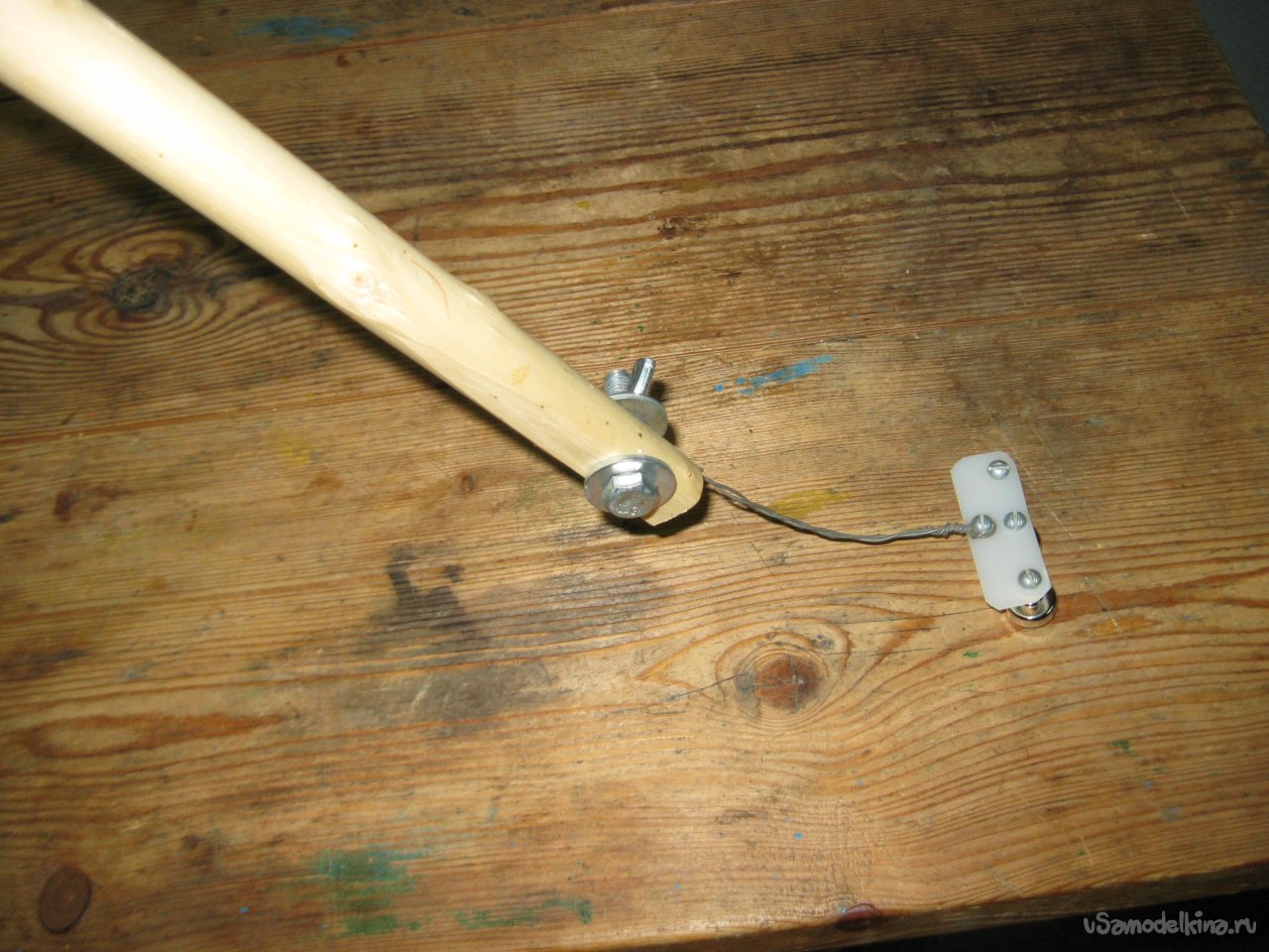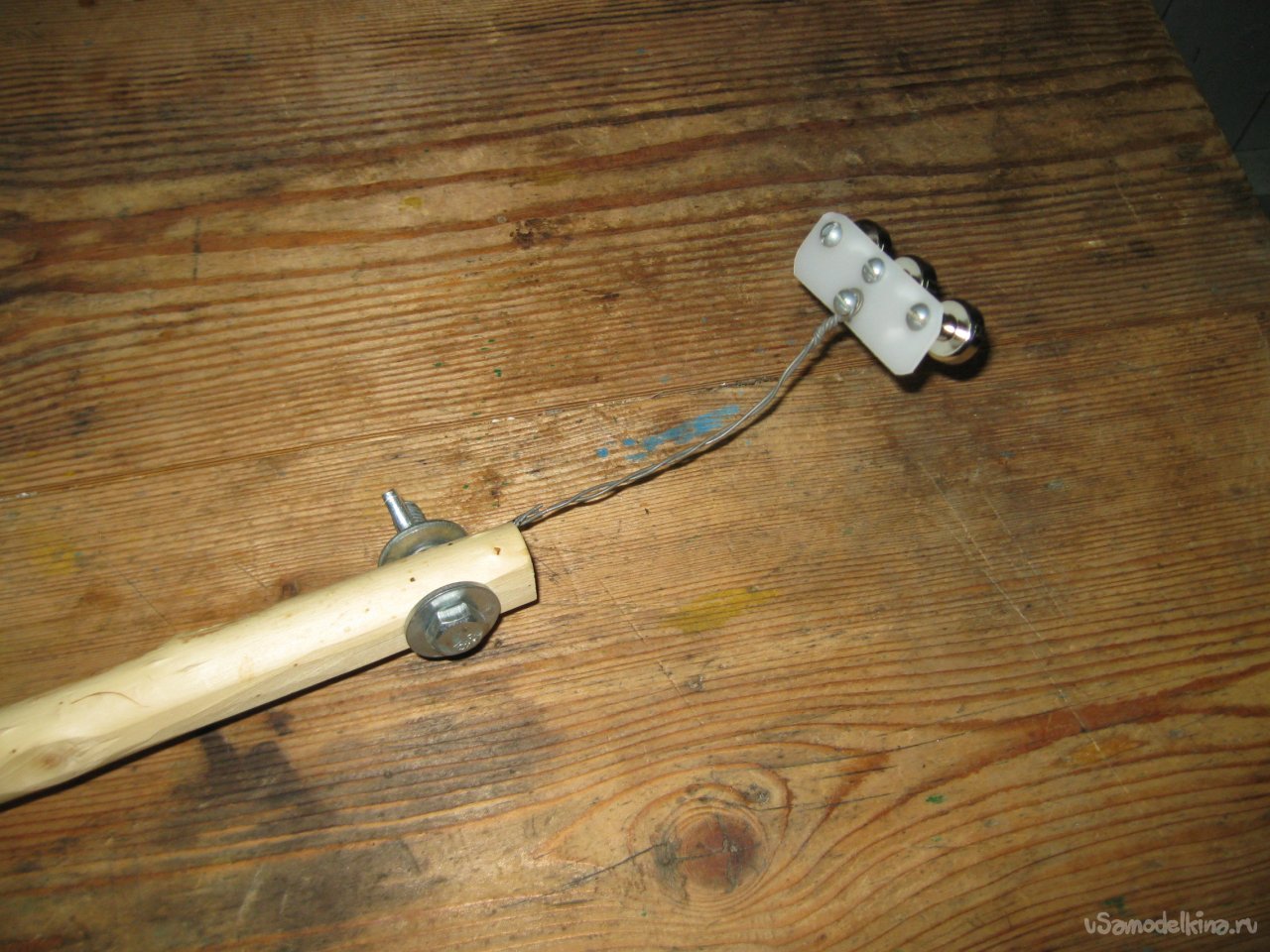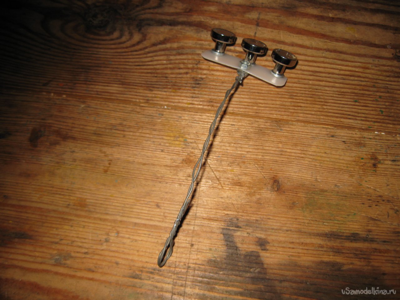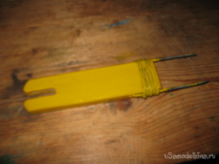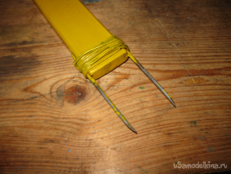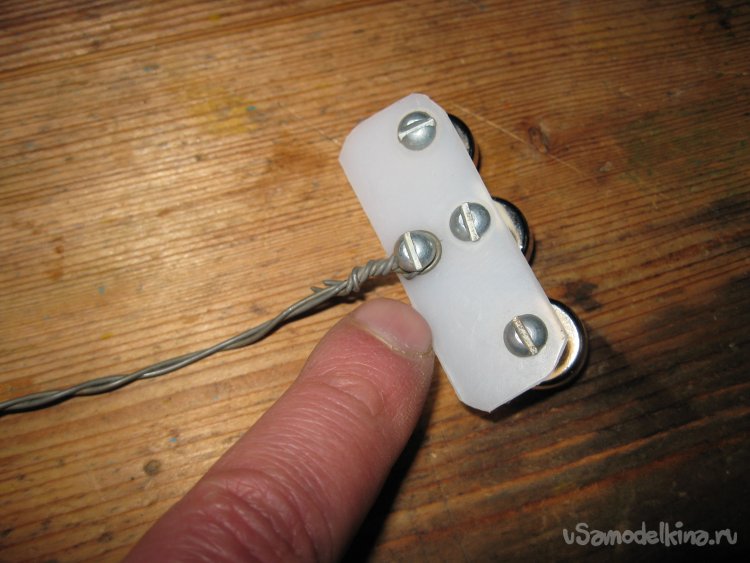 А с противоположной стороны пластинки, прикрепил проволочный поводок, для дальнейшего крепления данного приспособления к рукоятке.