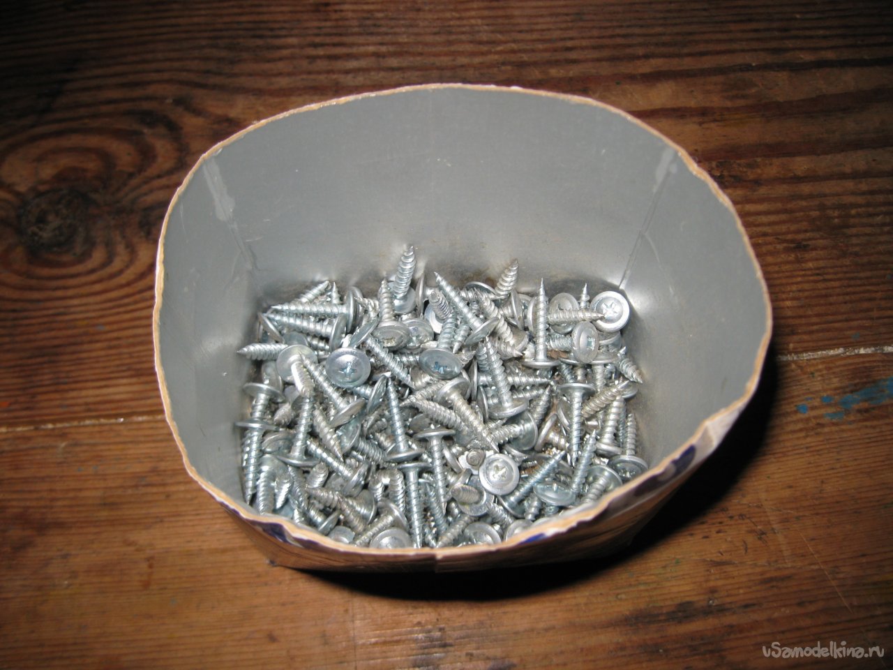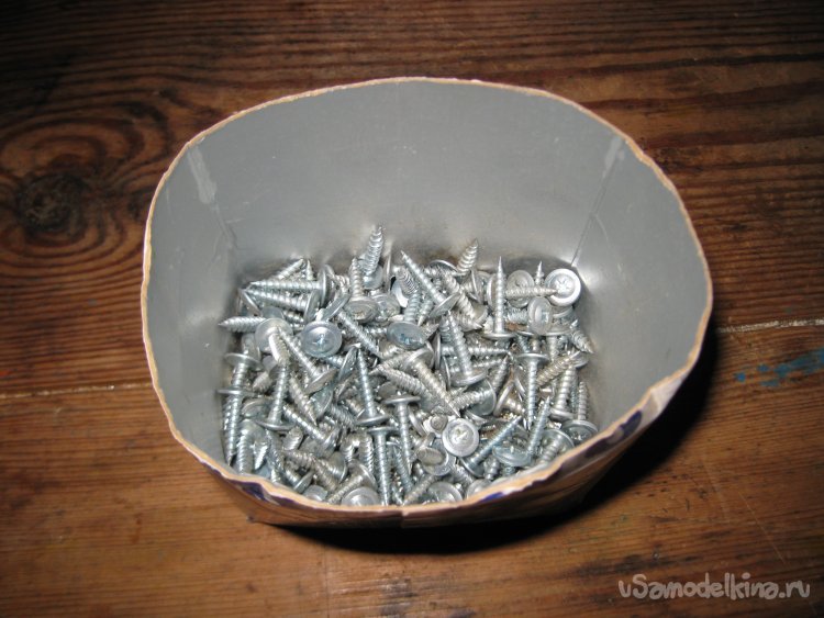 Так вот, после того, как я сделал это приспособление, я пошел в сад и очень быстро (за три, четыре захода), собрал все рассыпавшиеся шурупы.