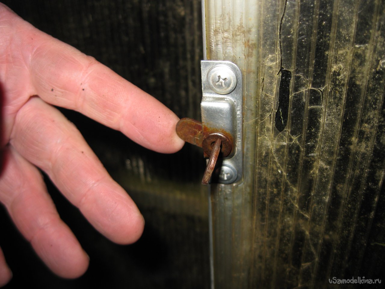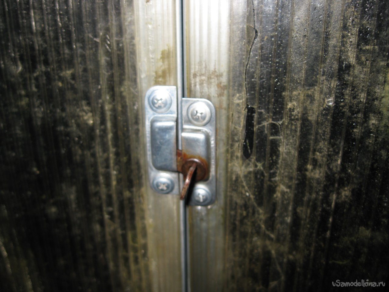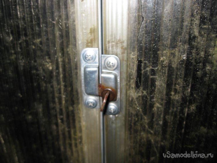 Она развалилась, и задвижка от нее упала в траву под дверцей.