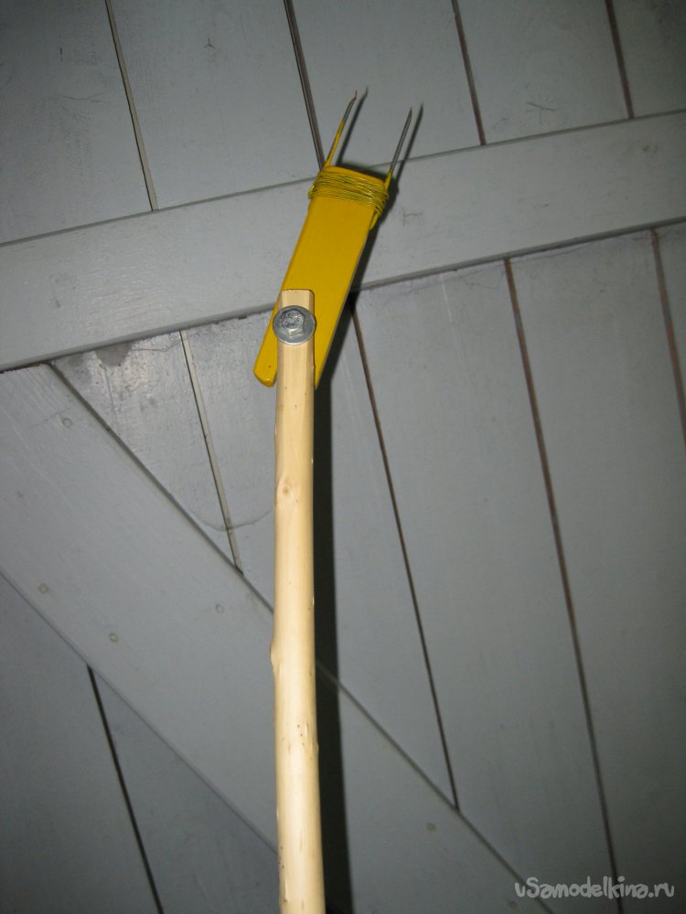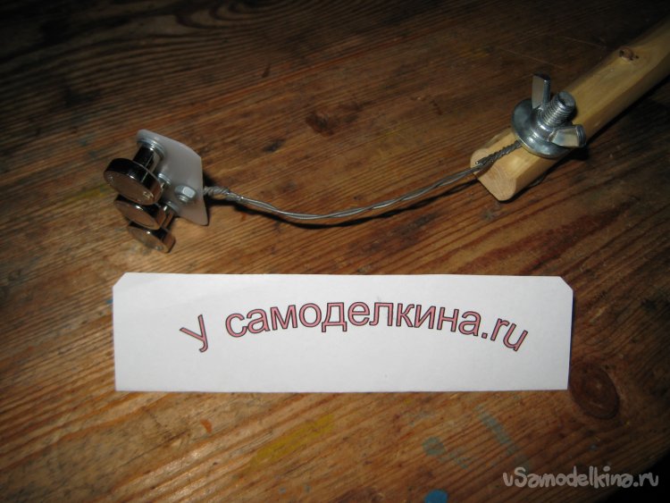 Эта самоделка представляет собой очень простое приспособление из нескольких неодимовых магнитов, закрепленных на конце длинной деревянной рукоятки, и предназначено для сбора рассыпавшихся мелких метизов и различного крепежа (гвоздей, шурупов, болтиков, гаек и т.п.).