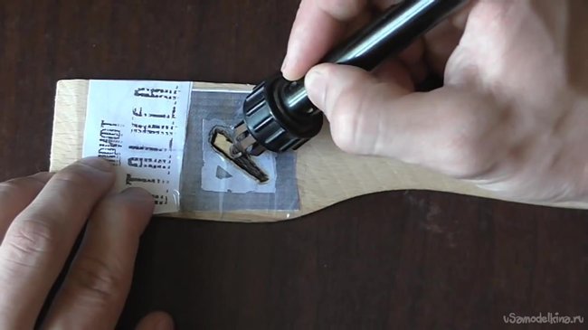 Первым делом берем наш кусок дерева (лопатку или линейку) и приклеиваем эскиз или эскизы на него прозрачным скотчем.