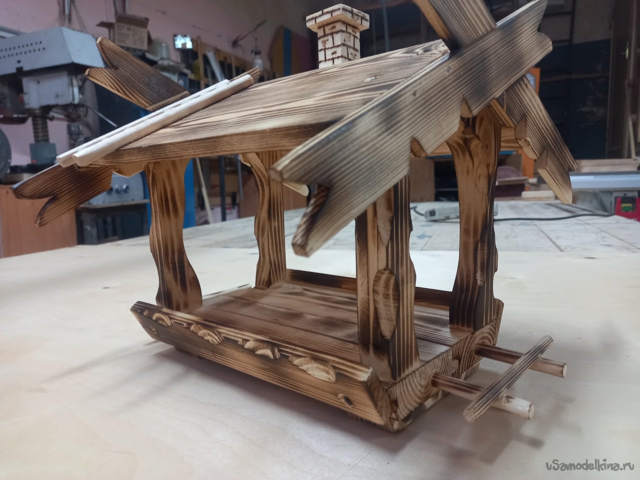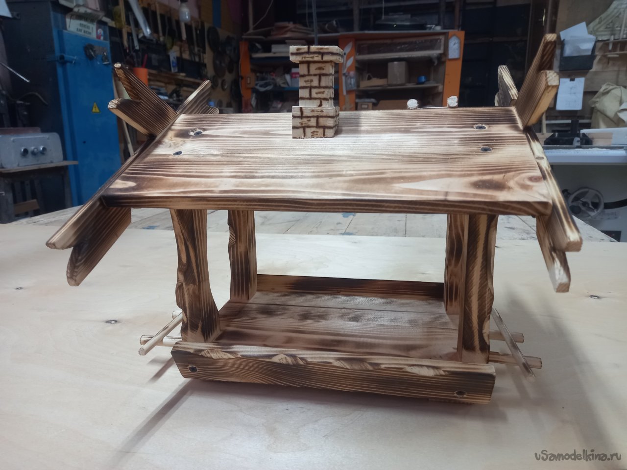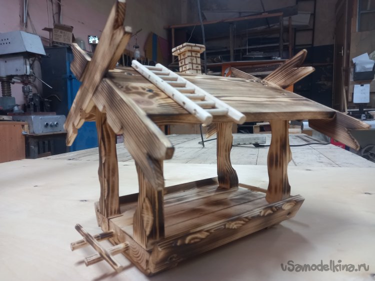 Дело было к вечеру, делать было нечего. Осмотревшись вокруг себя, я обнаружил много отходов после выполненного задания. Обычно, что бы не захламлять рабочее место, все перерабатывалось на дрова для дачи. Но тут вспомнились глазенки подрастающего поколения и меня понесло... Надо чем то порадовать внучат, А что в наше время можно дать детворе? У них все есть. Я вот в их возрасте обруч катал подталкивая его хворостинкой и был счастлив. В общем почесал затылок и перебирая варианты решил сделать кормушку для птичек. Думаю, будут выбегать на улицу корм насыпать в кормушку, а то засиделись у компов.Как делал не фиксировал, не ка невидаль, Думал сляпаю побыстрей да попроще, а подом увлекся. Короче вот, что получилось. Следующий вариант буду делать обдуманно.