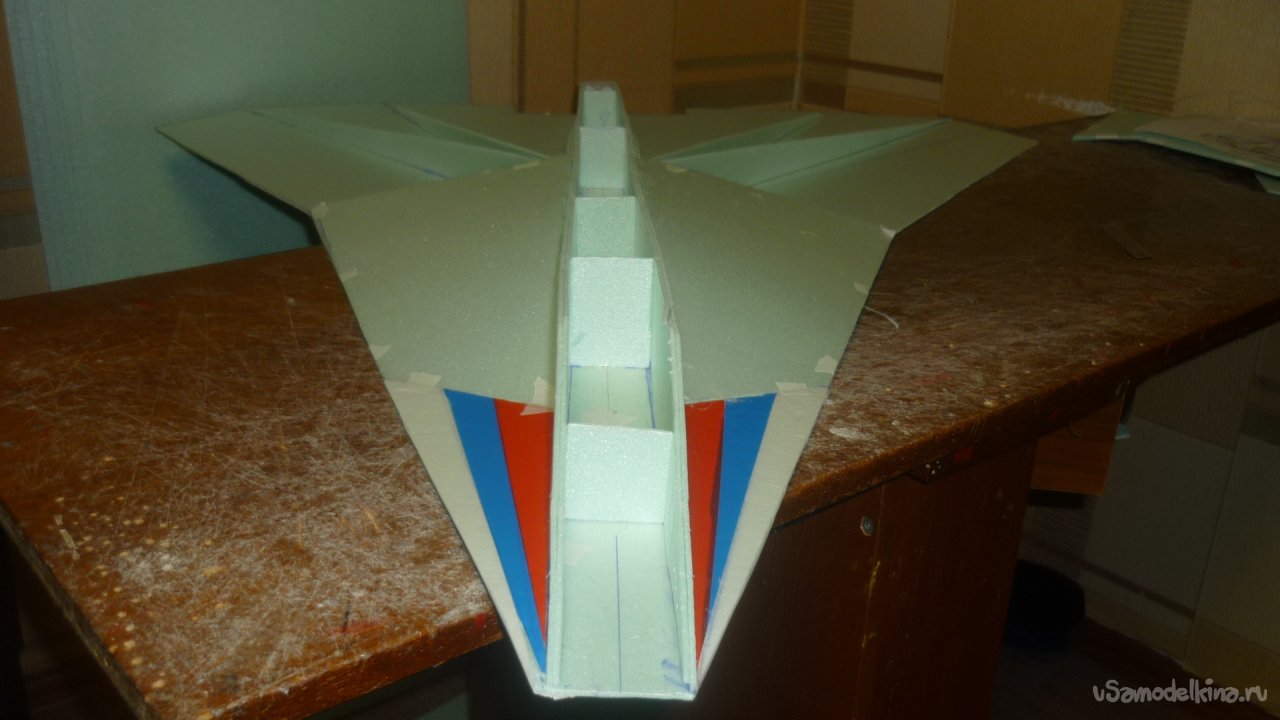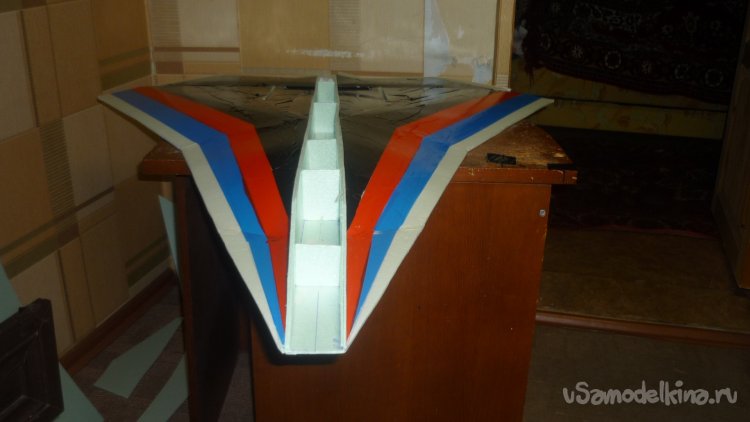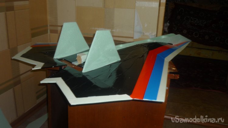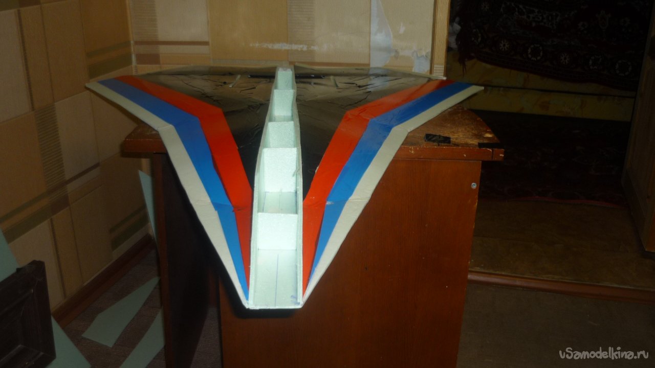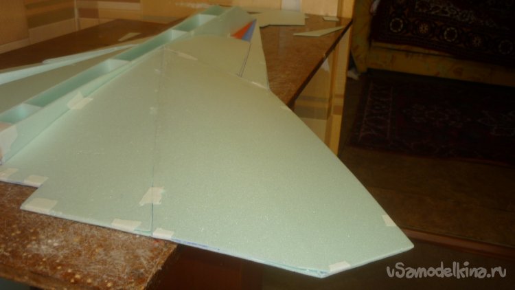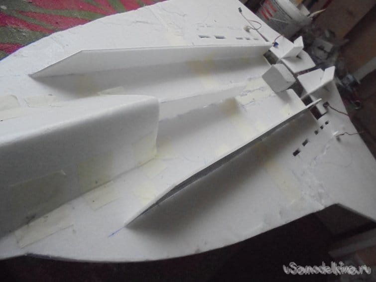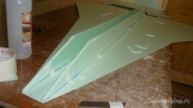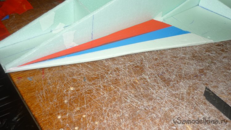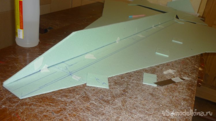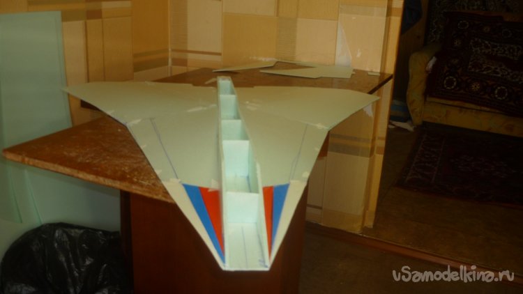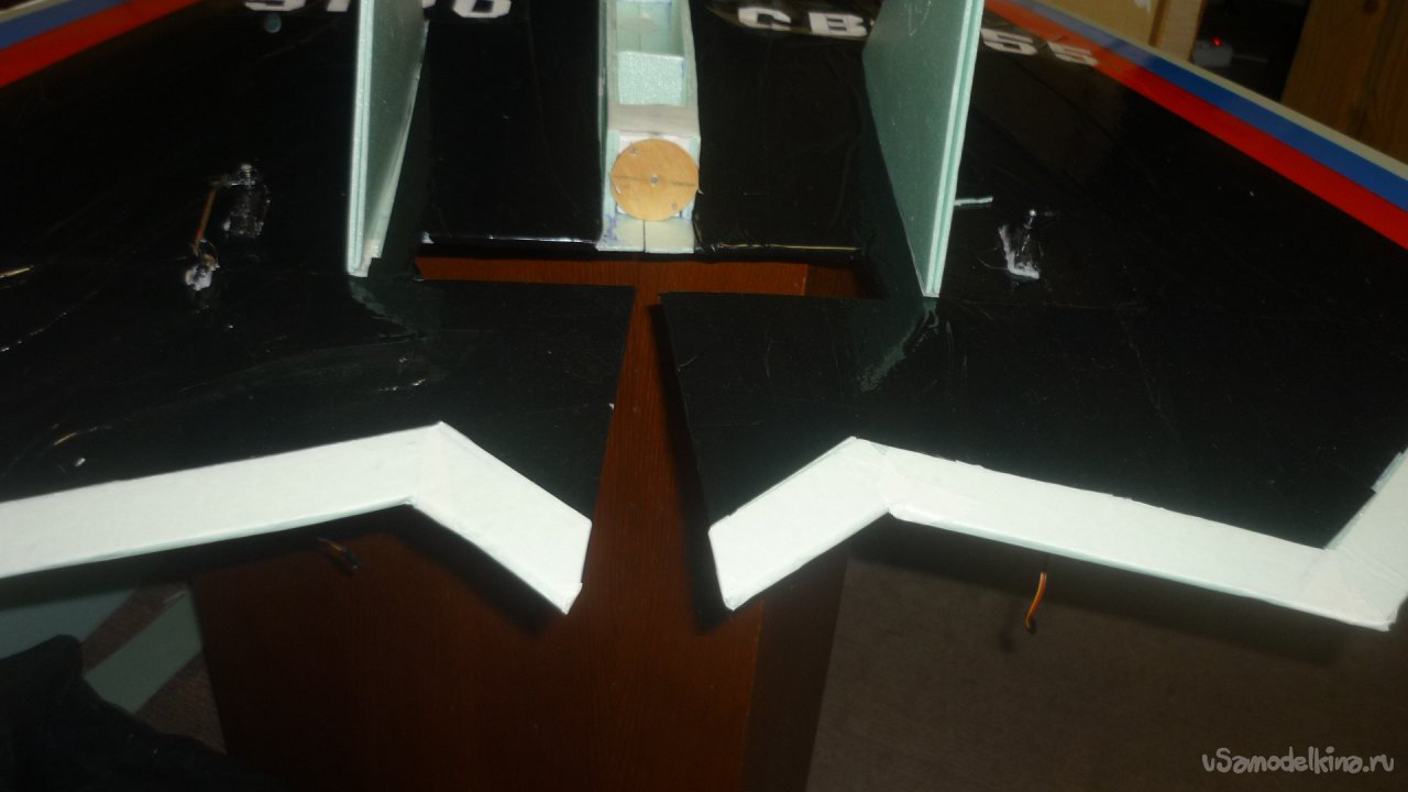 Во внешней обшивке, хвостовой части модели сделал прорези для установки килей. На бумажный, малярный скотч навесил элевоны.