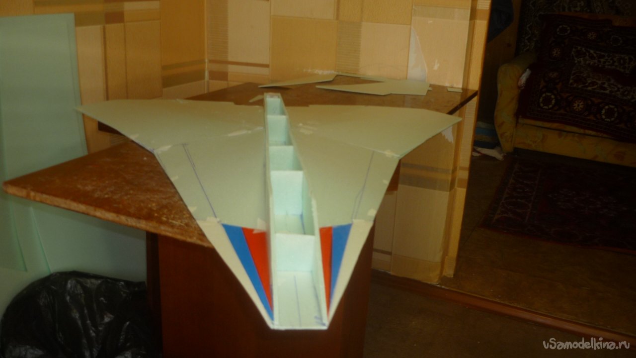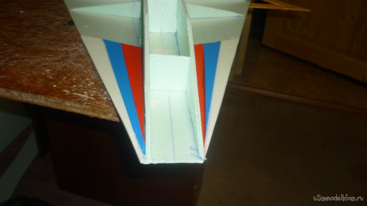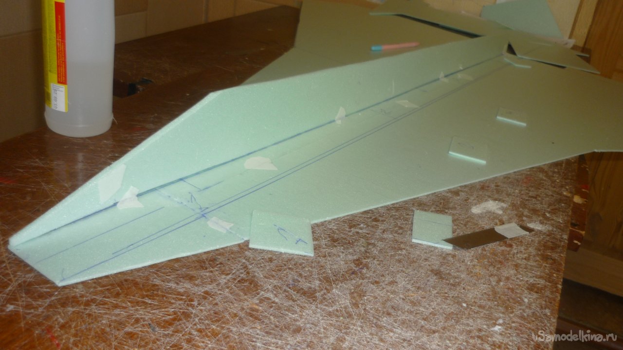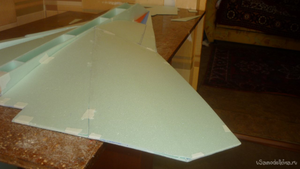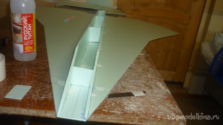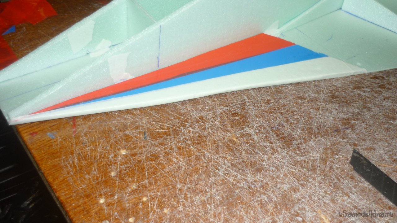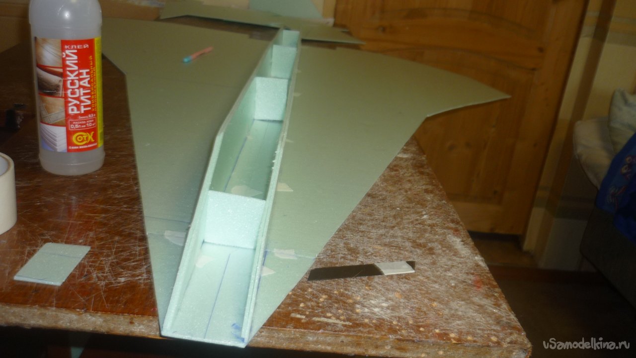 Во внешней обшивке, хвостовой части модели сделал прорези для установки килей. На бумажный, малярный скотч навесил элевоны.