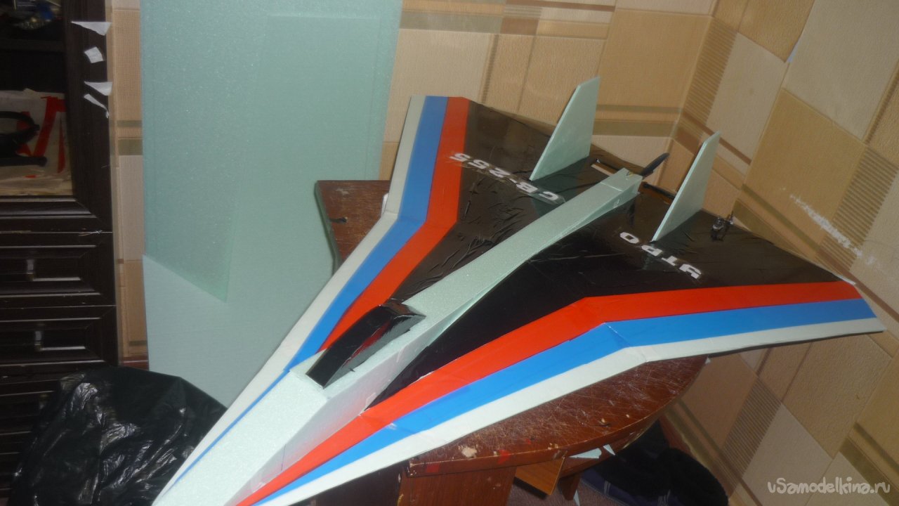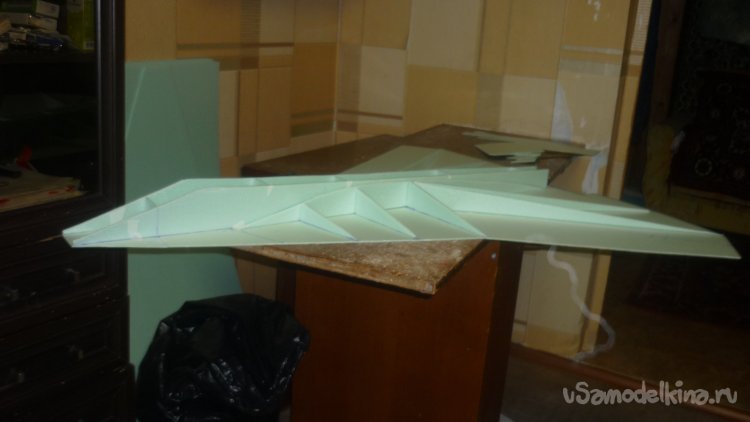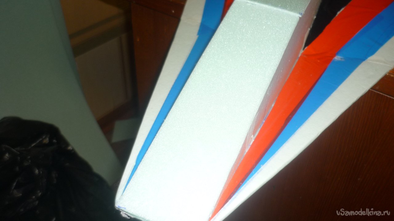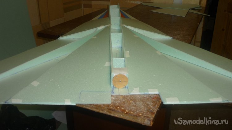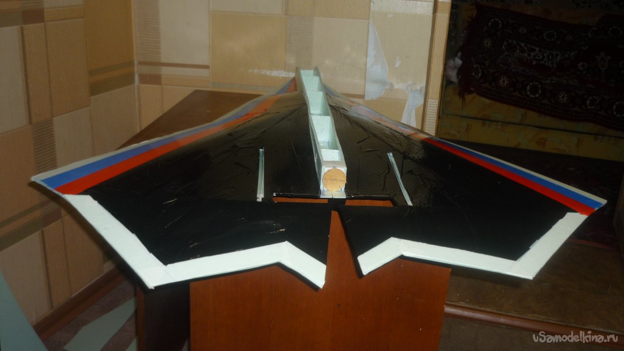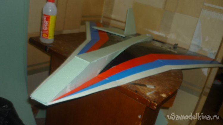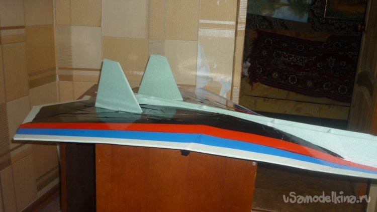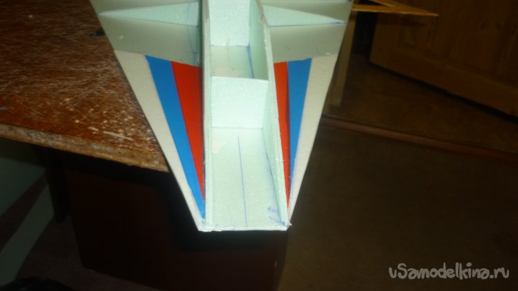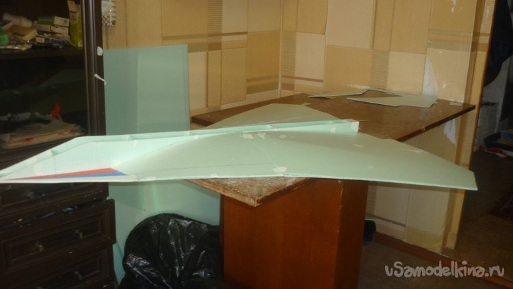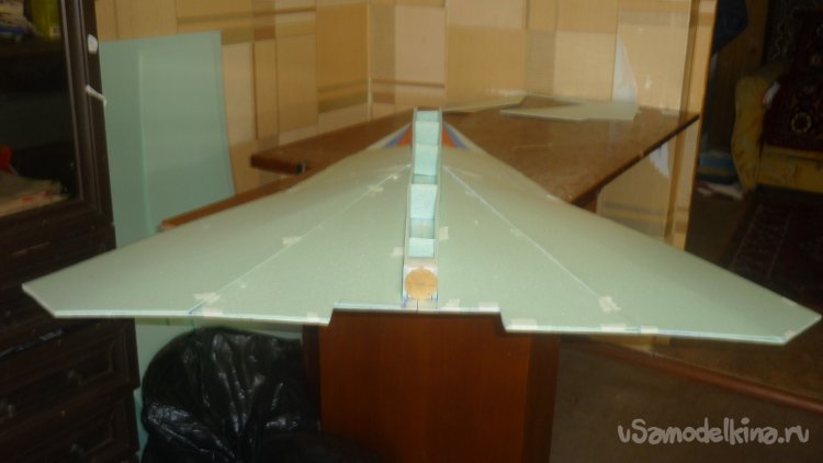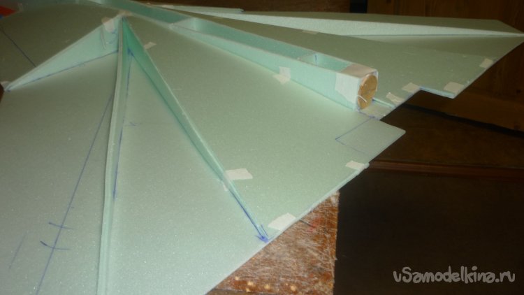 Во внешней обшивке, хвостовой части модели сделал прорези для установки килей. На бумажный, малярный скотч навесил элевоны.