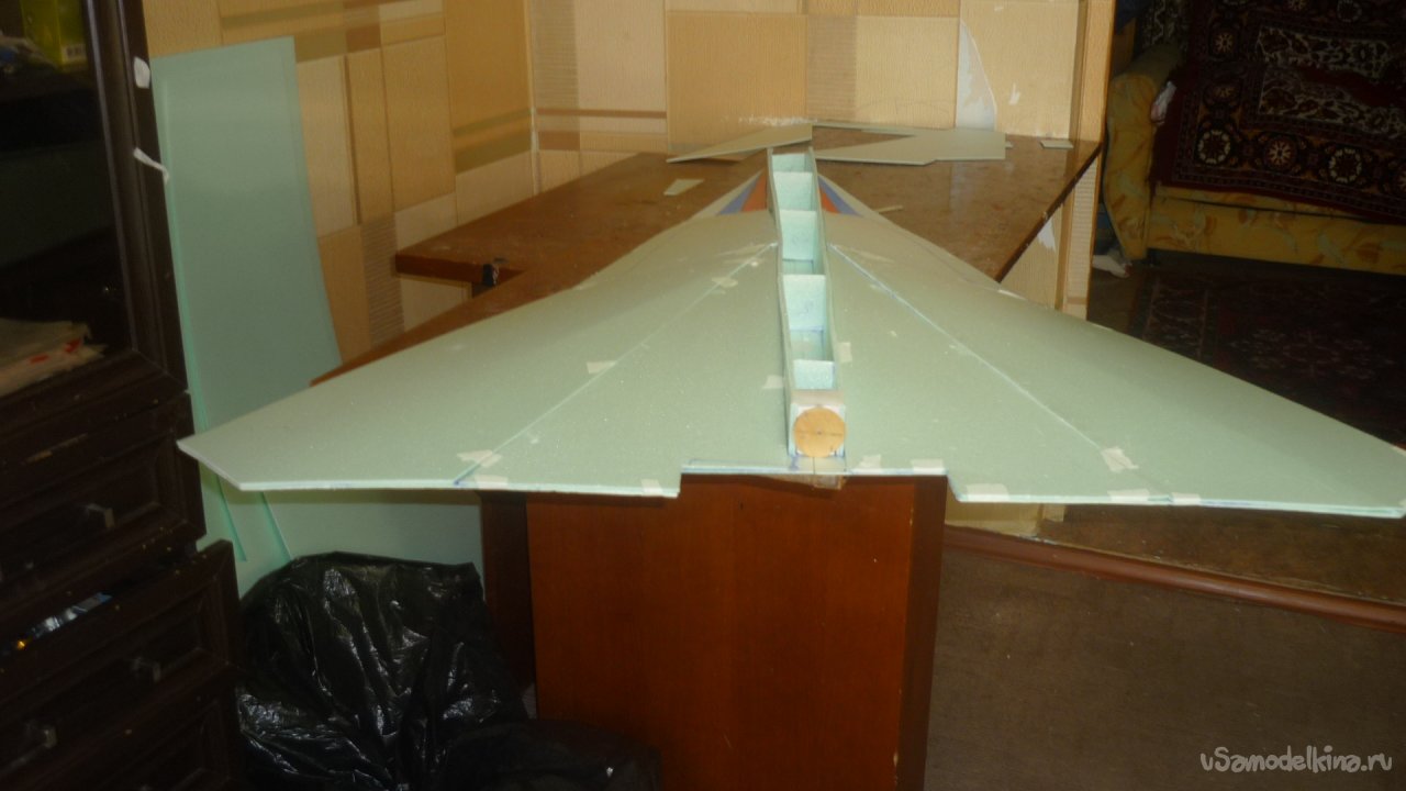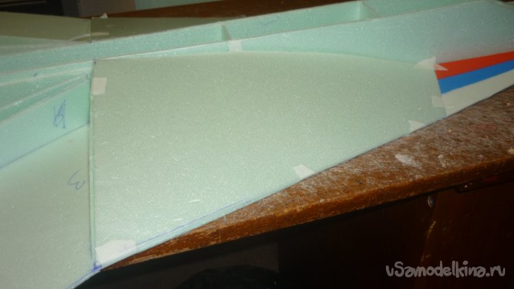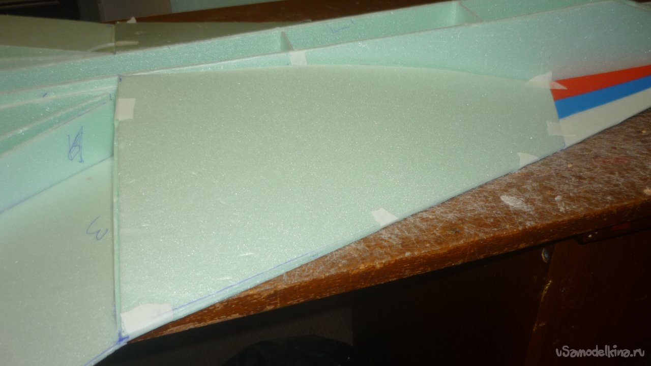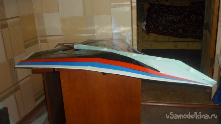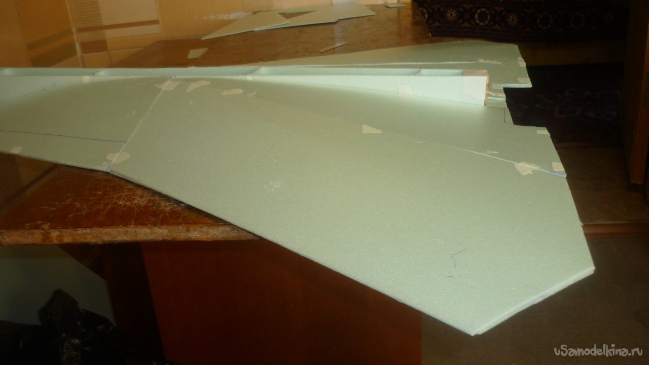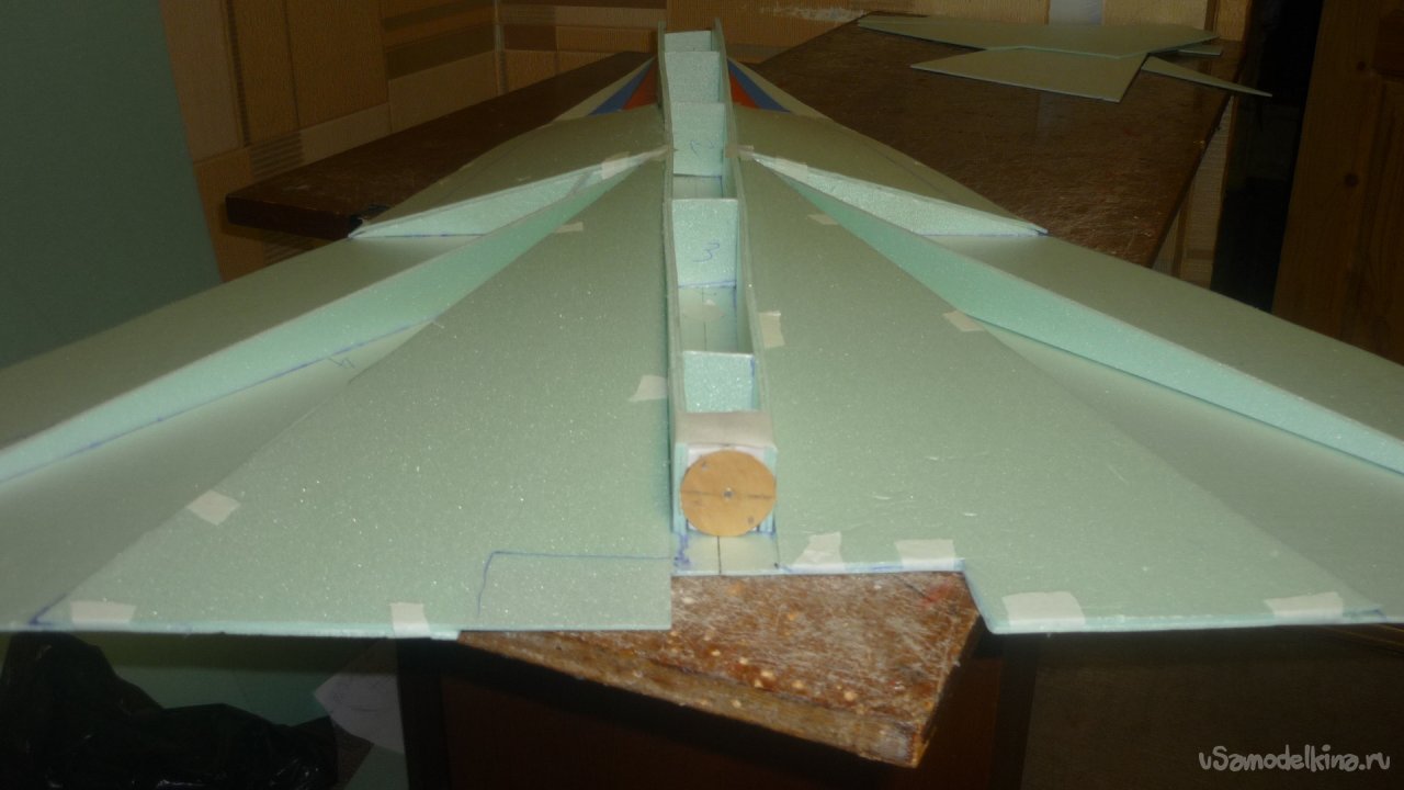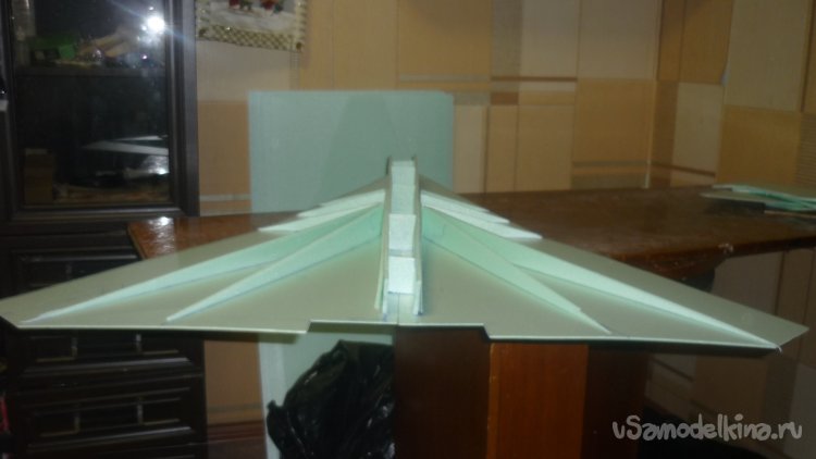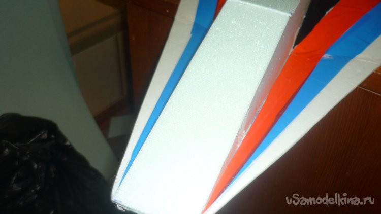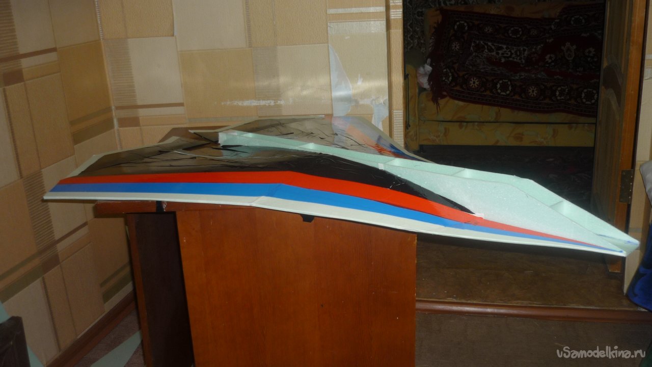 Во внешней обшивке, хвостовой части модели сделал прорези для установки килей. На бумажный, малярный скотч навесил элевоны.