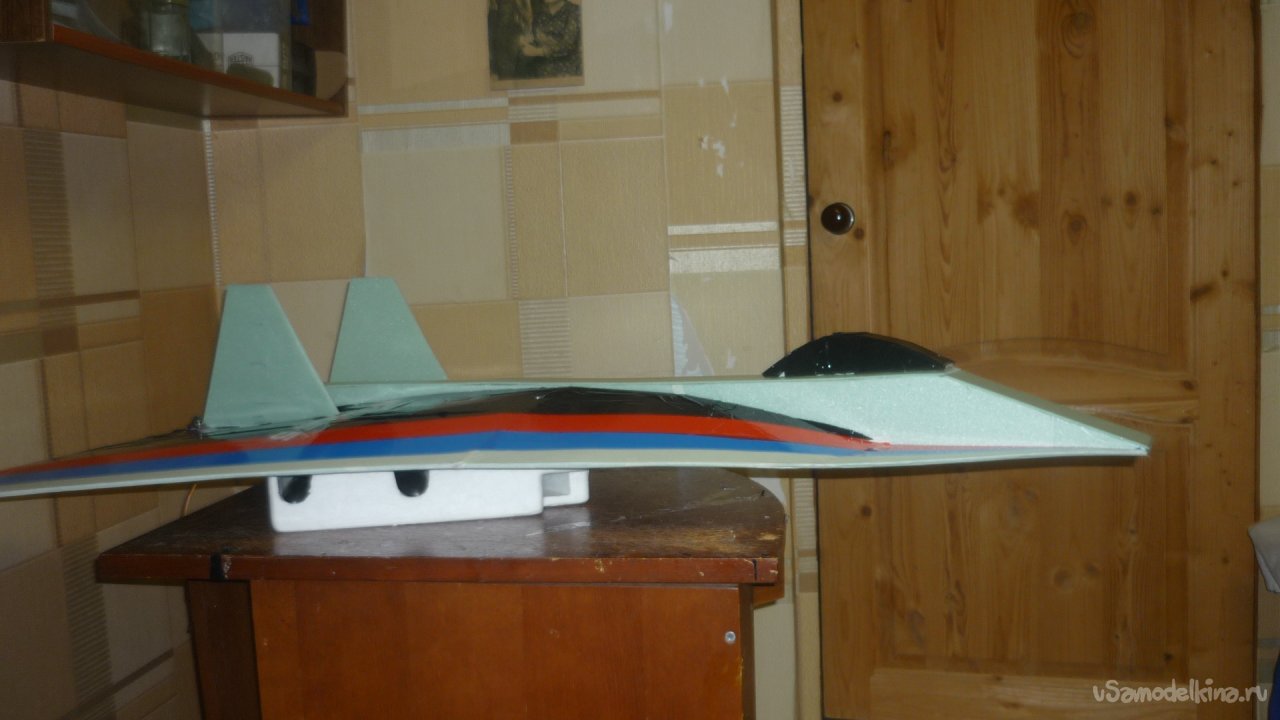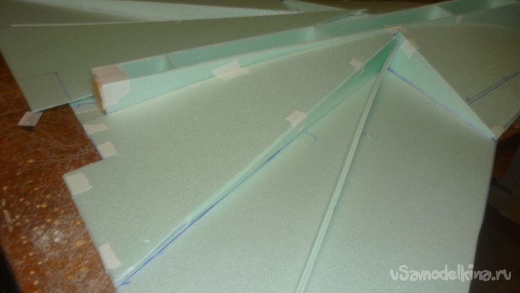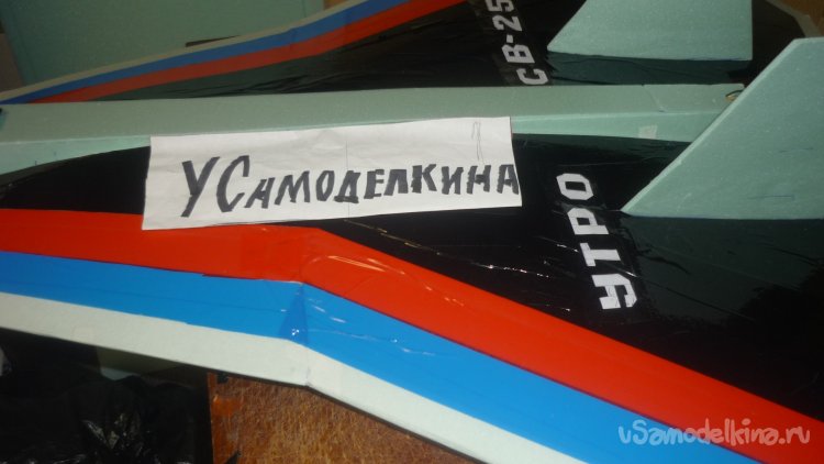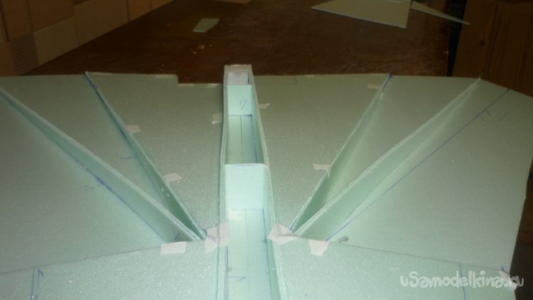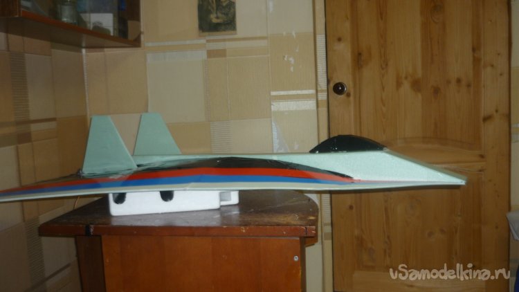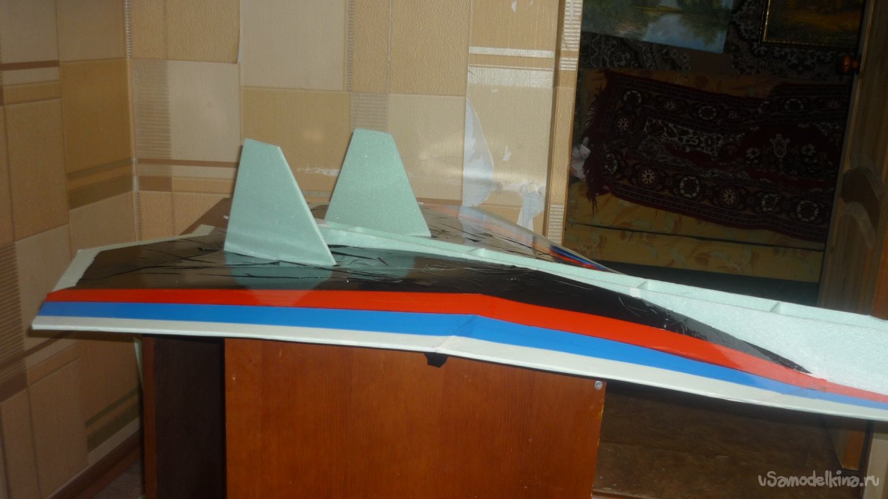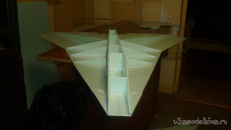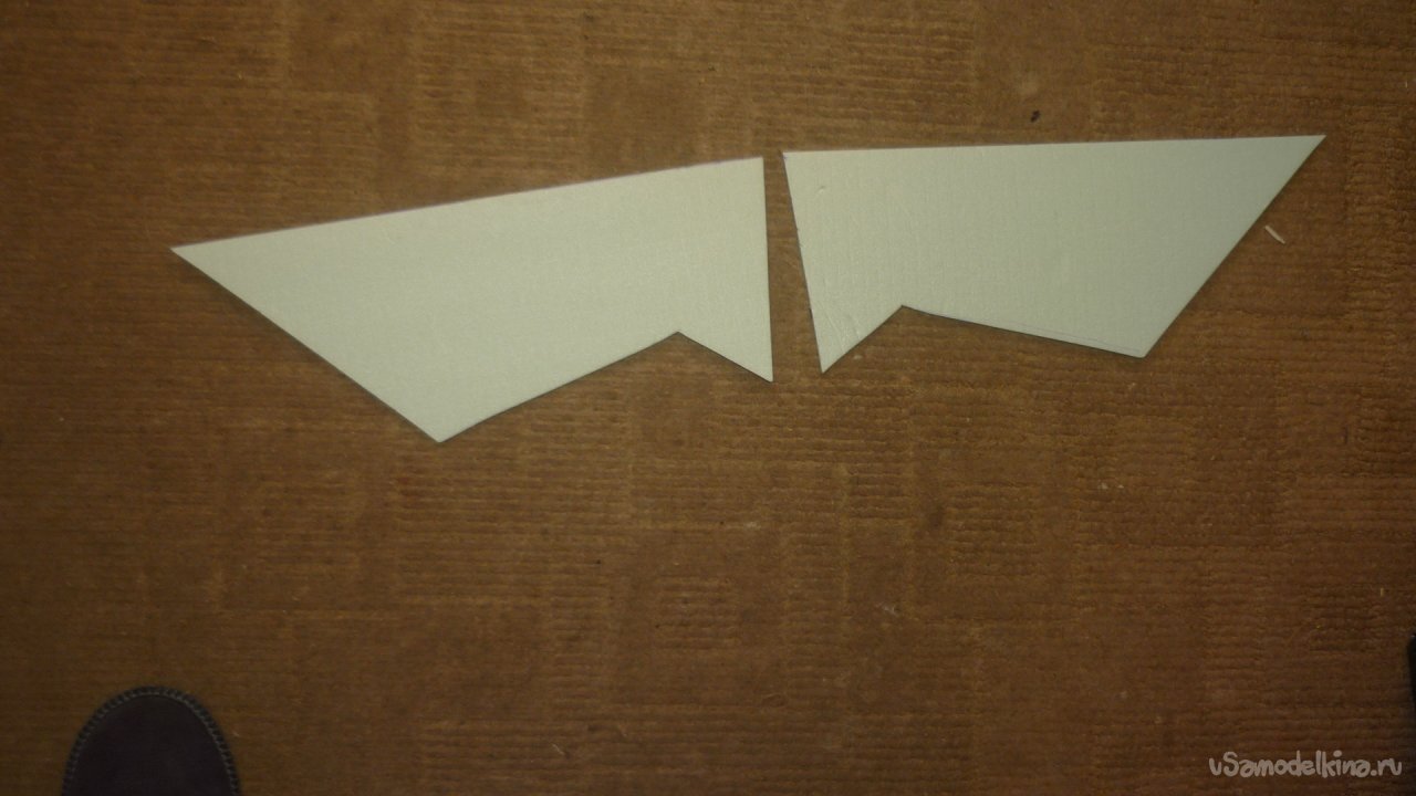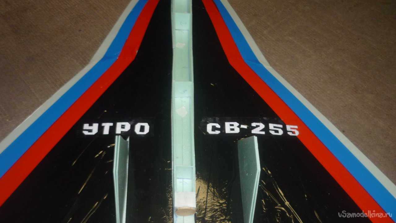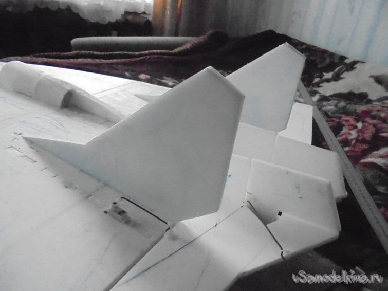 Во внешней обшивке, хвостовой части модели сделал прорези для установки килей. На бумажный, малярный скотч навесил элевоны.