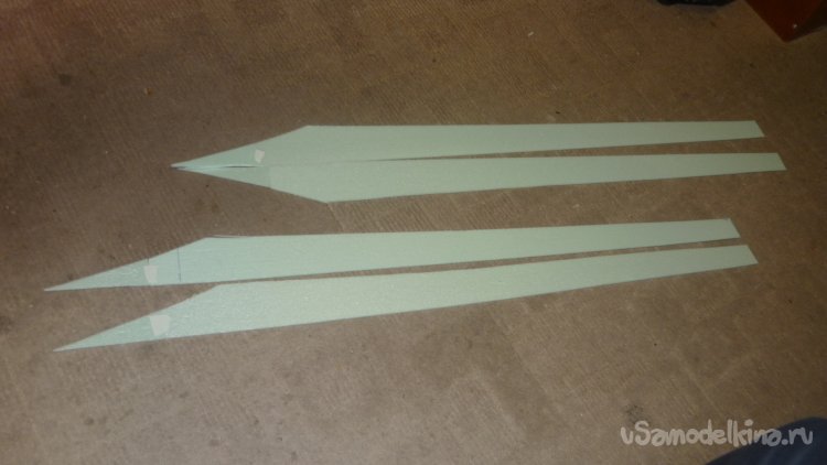 Сразу вырезал второй слой элевонов, они склеиваются в два слоя. Внутри вклеиваются деревянные реечки, сечением 2,5 х 2,5 мм.