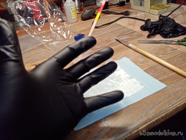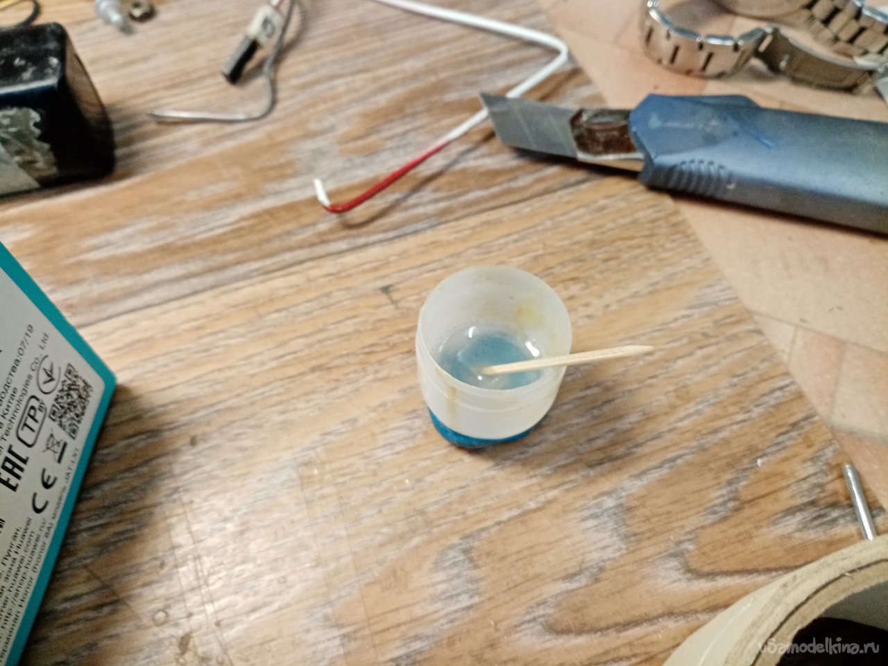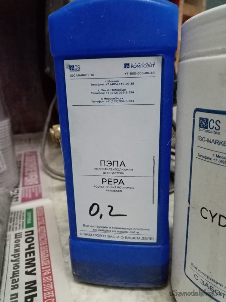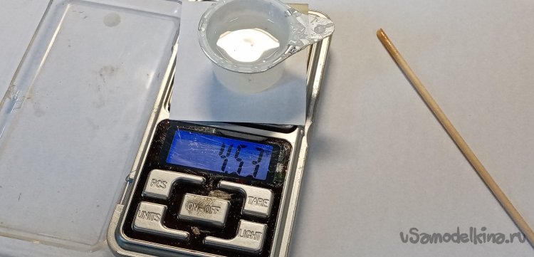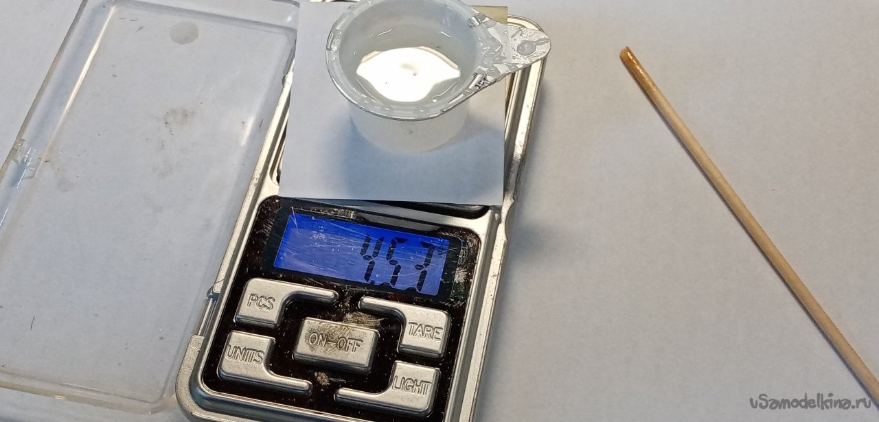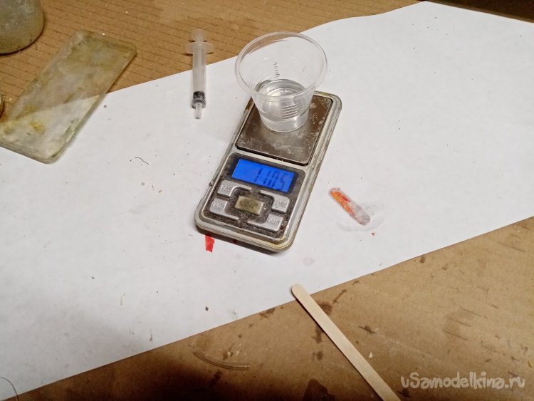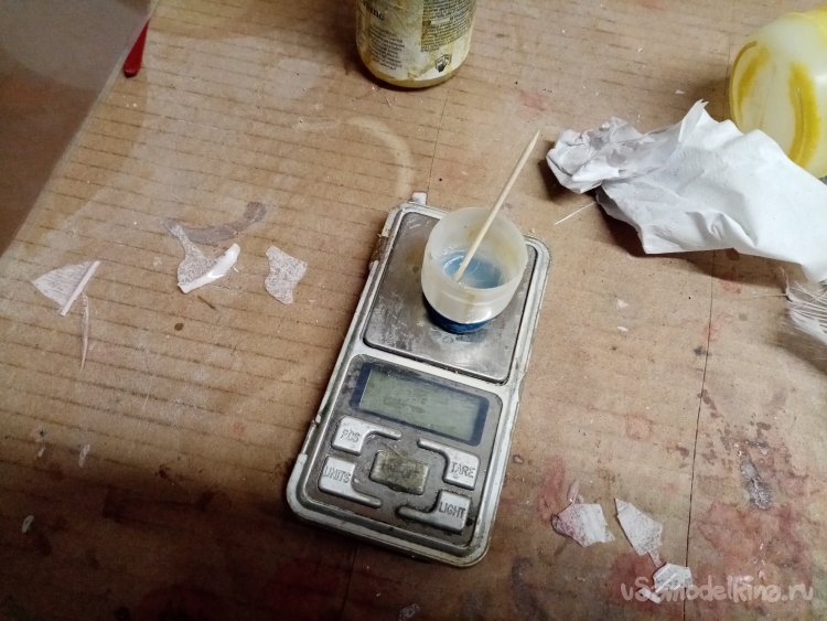 Развожу смолу и как описано выше пропитываю стеклоткань. В этом варианте приходится разводить смолы понемногу. Для этой цели использую баночки от сливок. Развожу по 4 грамма на ювелирных весах.