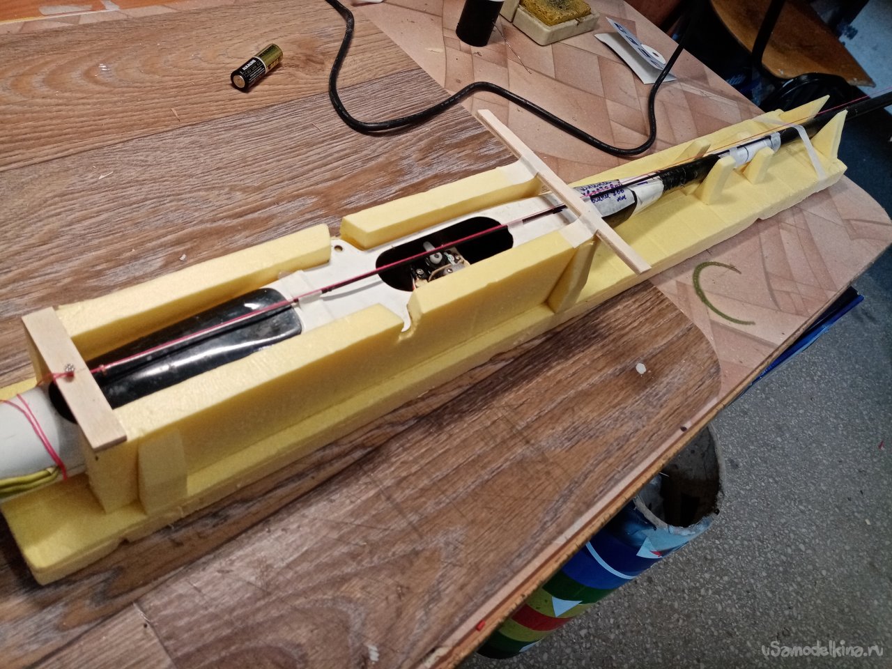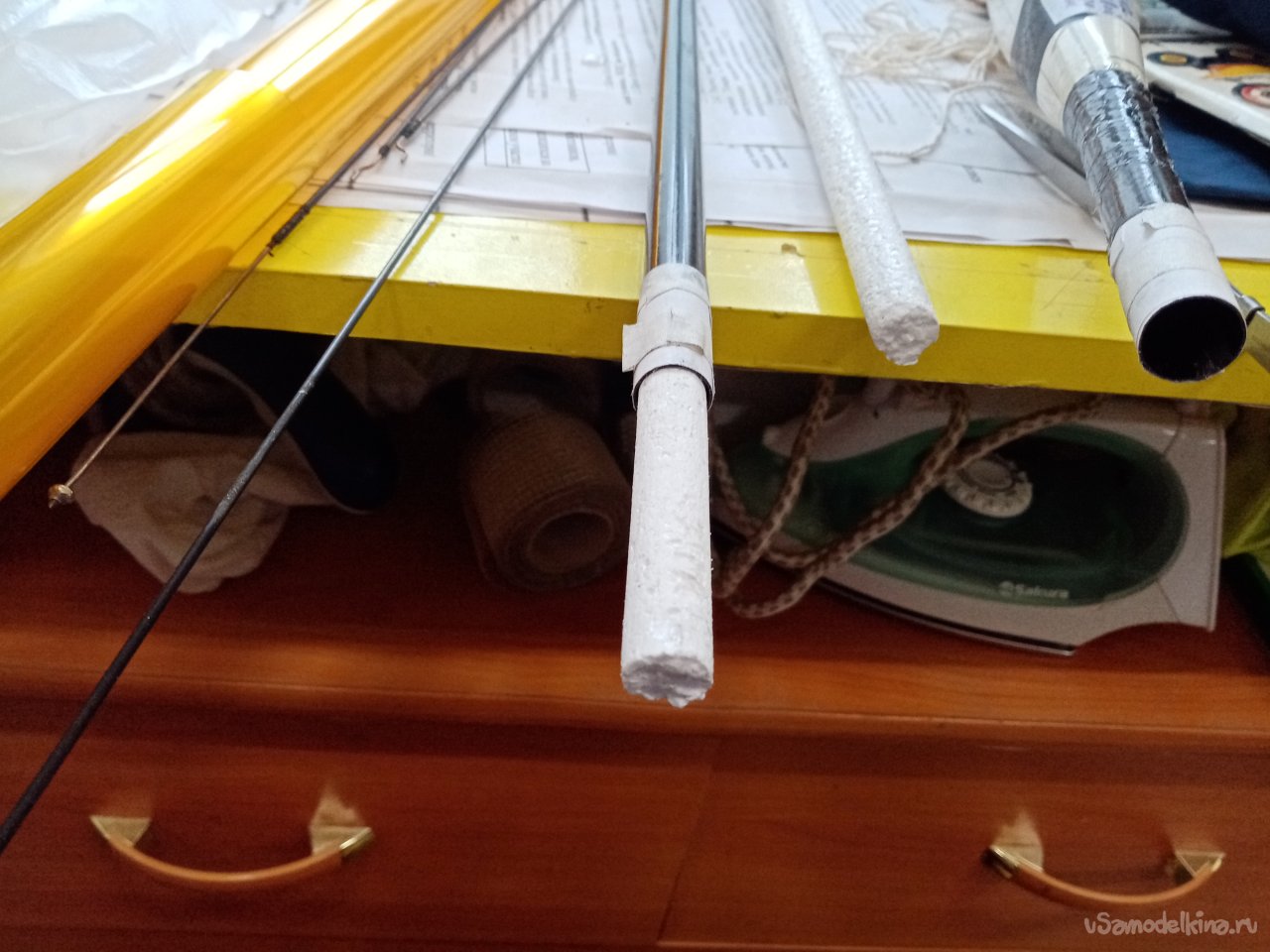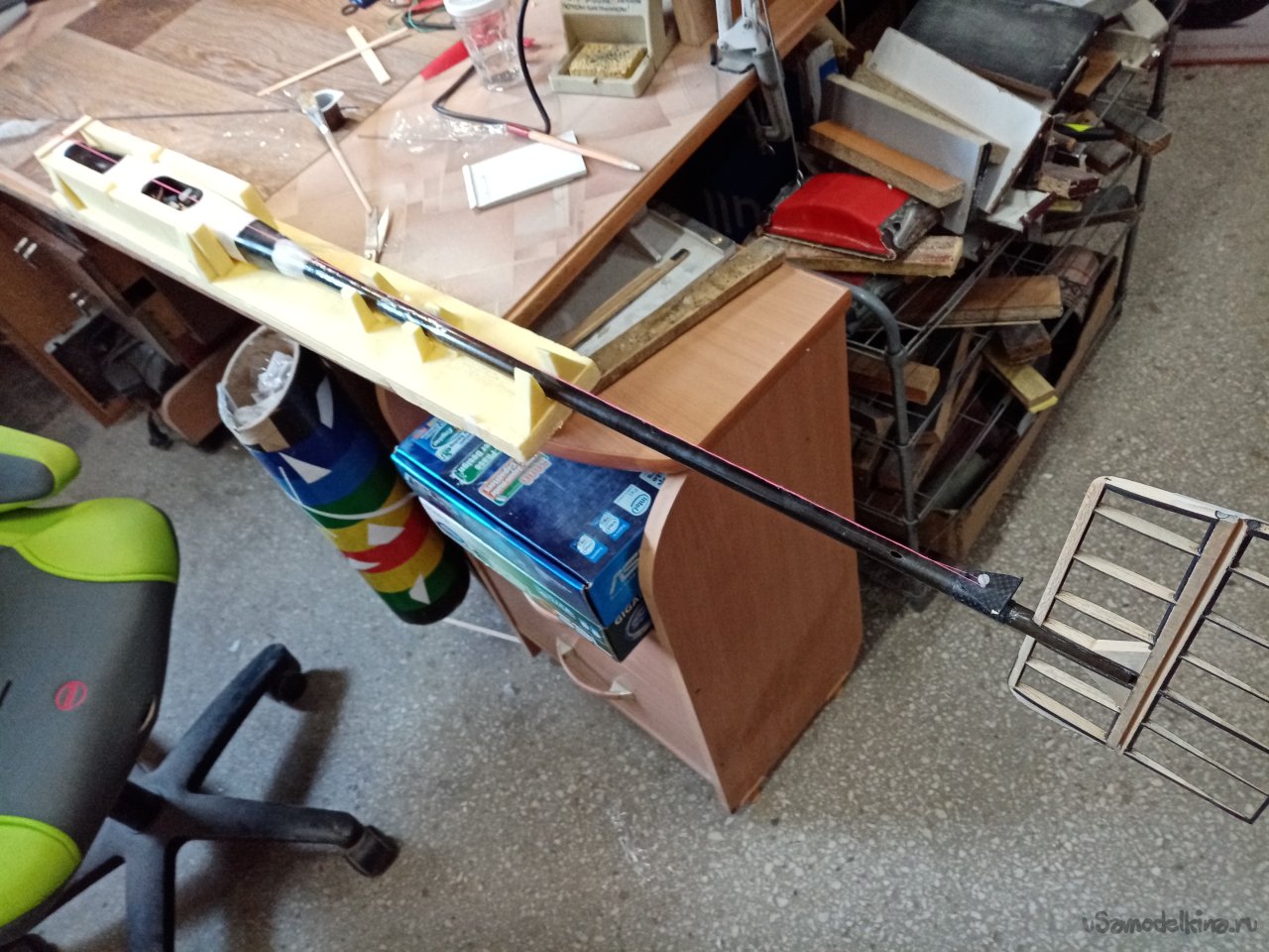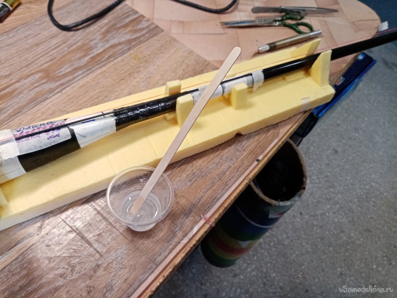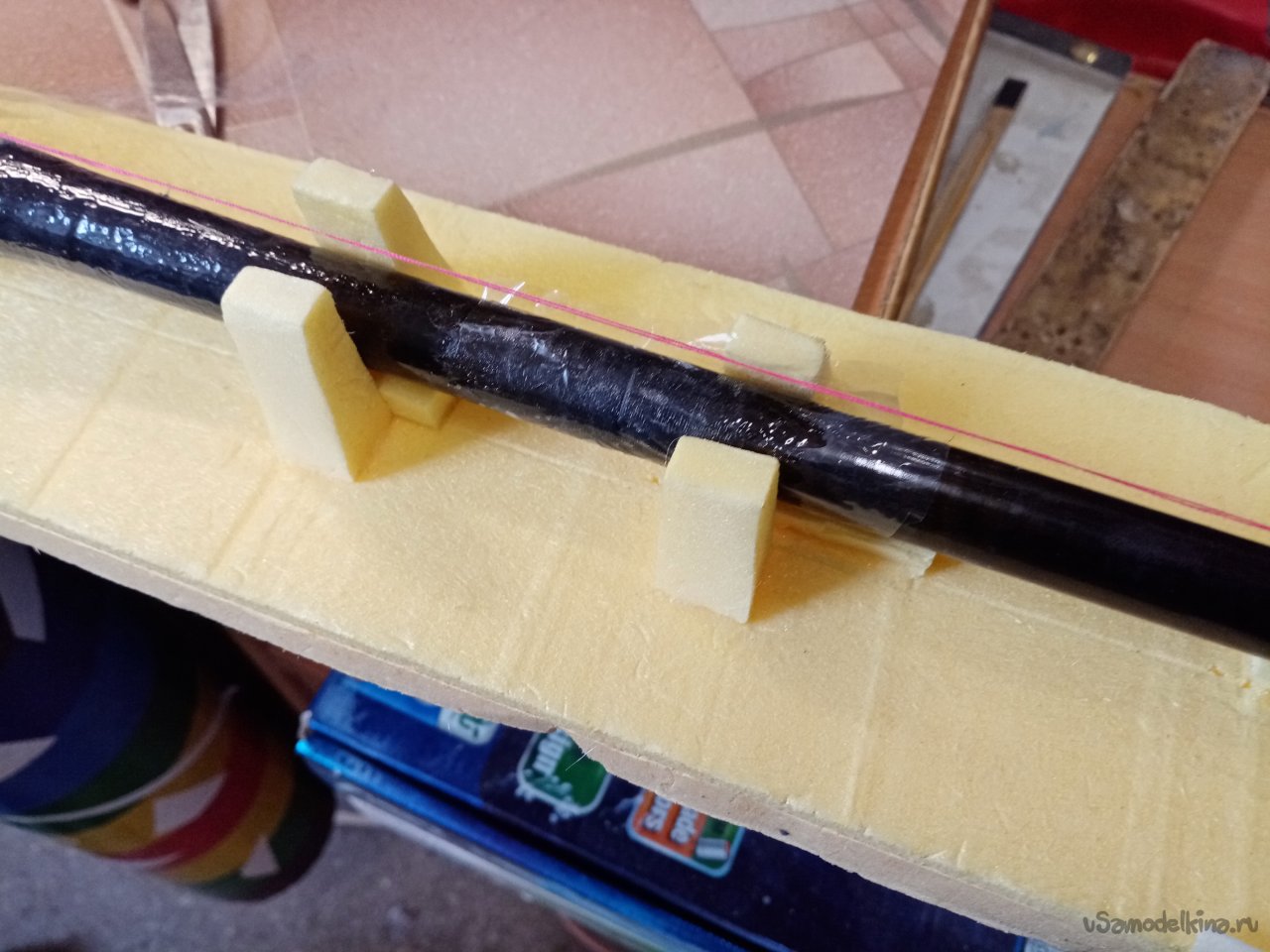 Стапель был изготовлен из обрезков пенопласта с надежной фиксацией хвостовой балки в нужном положении. Внутренний фиксирующий цилиндр установлен на место на эпоксидной смоле. Конструкция закреплена на стапеле. Жду застывания клея.