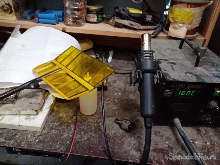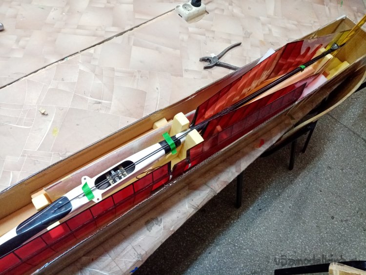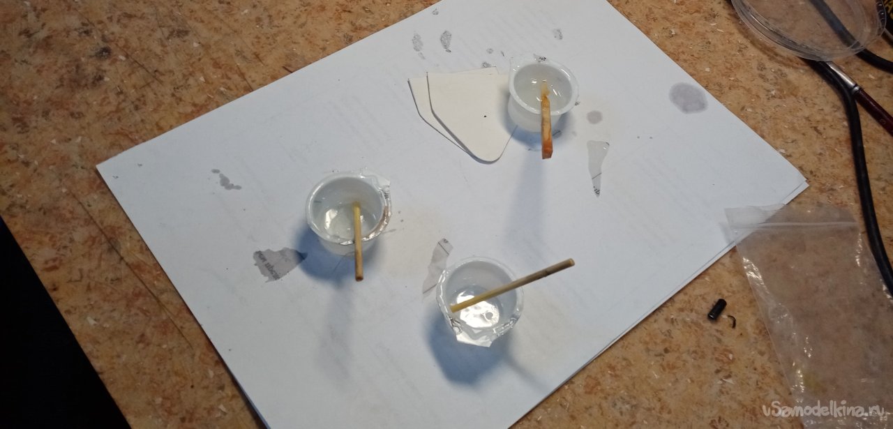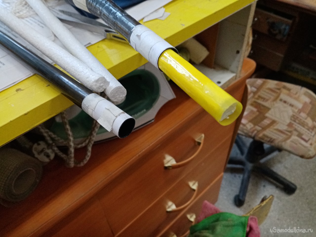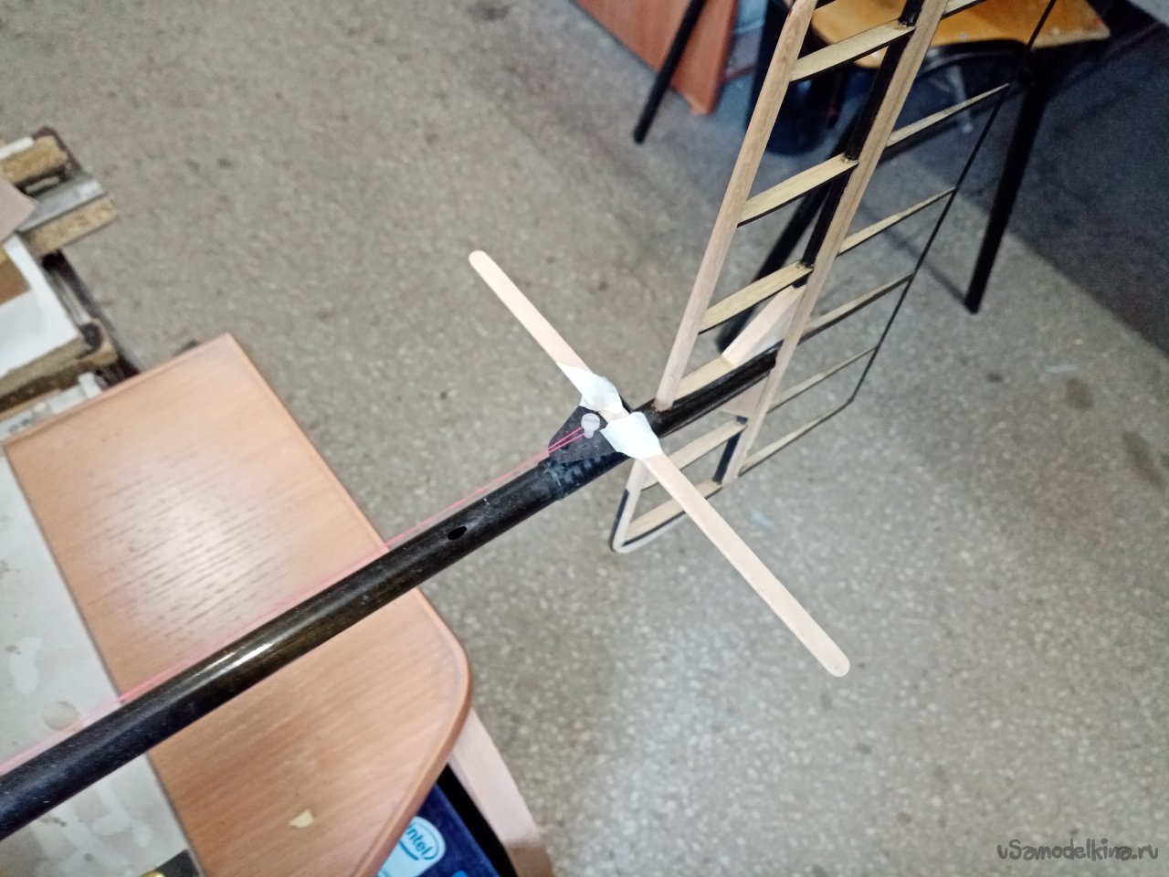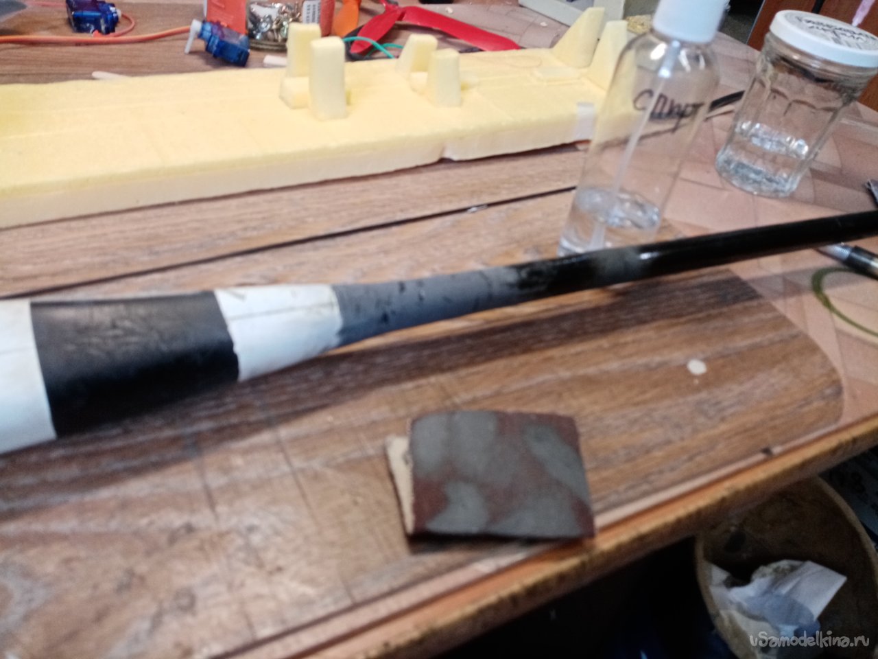 Стапель был изготовлен из обрезков пенопласта с надежной фиксацией хвостовой балки в нужном положении. Внутренний фиксирующий цилиндр установлен на место на эпоксидной смоле. Конструкция закреплена на стапеле. Жду застывания клея.