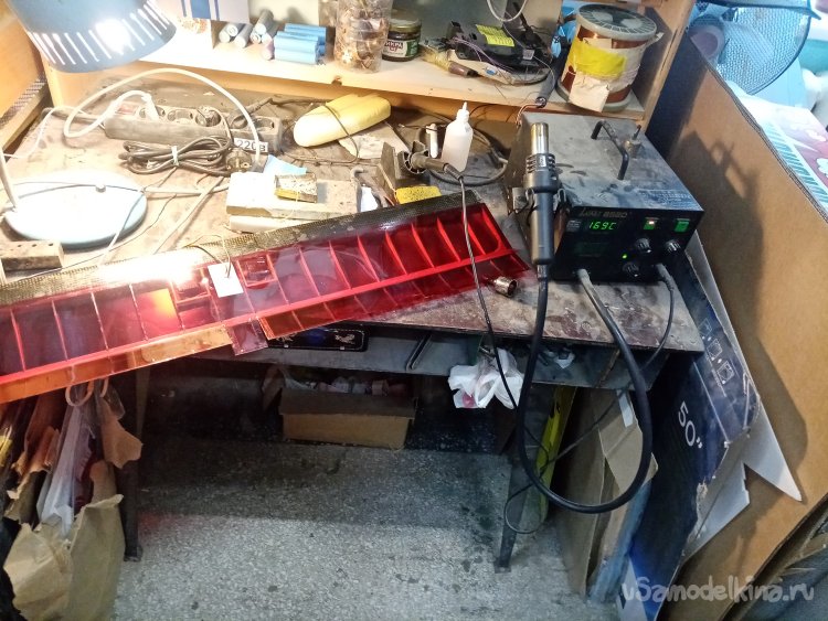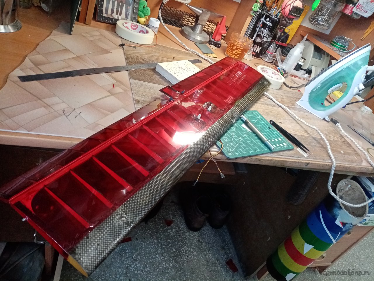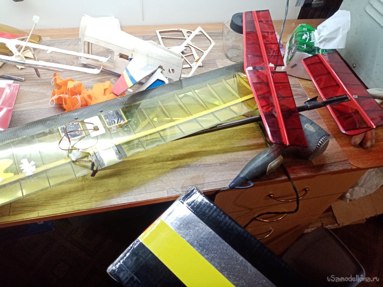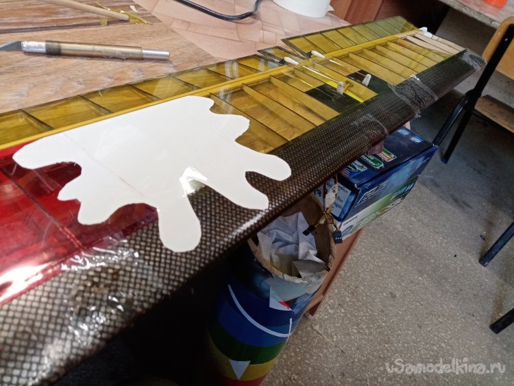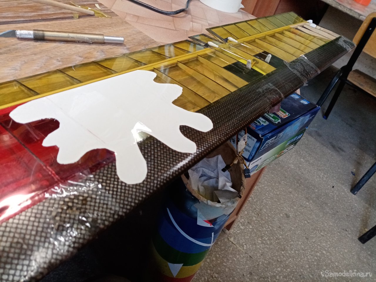 У моего товарища по борьбе нашелся небольшой рулончик красной пленки. Очень похожий цветом на оригинал. Проблем с обтяжкой не возникло. По контуру оклеиваю крыло при помощи утюга. Затем натягиваю пленку феном и после утюгом привариваю по нервюрам.