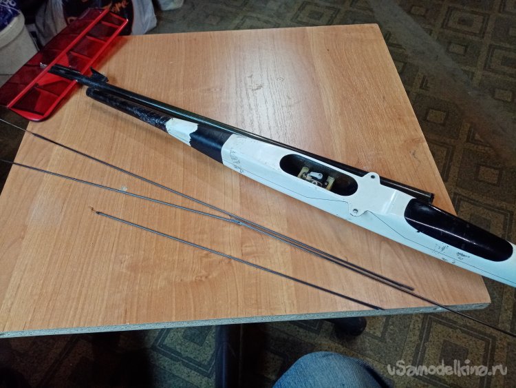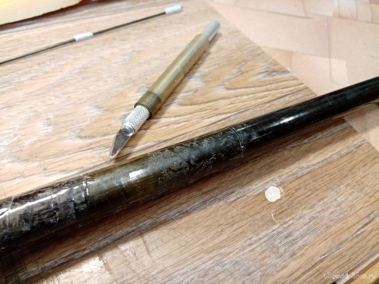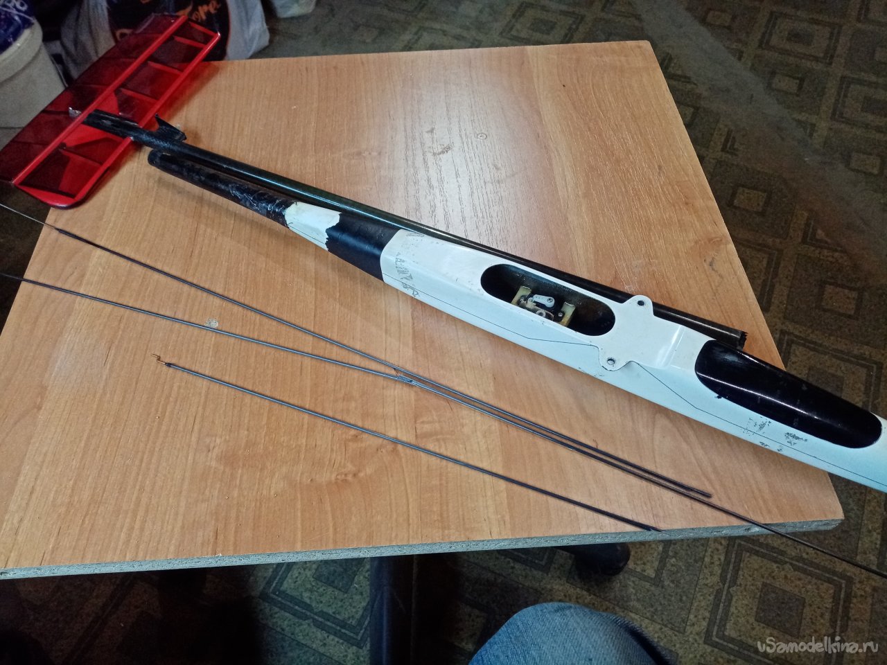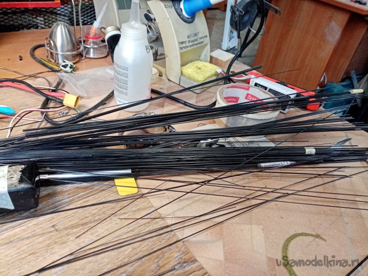 Перехожу к ремонту сломанных тяг на рудер элеватор. Которые проходят в нутрии хвостовой балки. Они тоже сломаны с расщеплением. Состоят из трубочек диметром в 2 миллиметра. На концах вклеены проволочки, которые соединяются с качалками сервоприводов и кабанчиками на подвижных элементах управления. С этим вариантом немного проще резать придется мало.