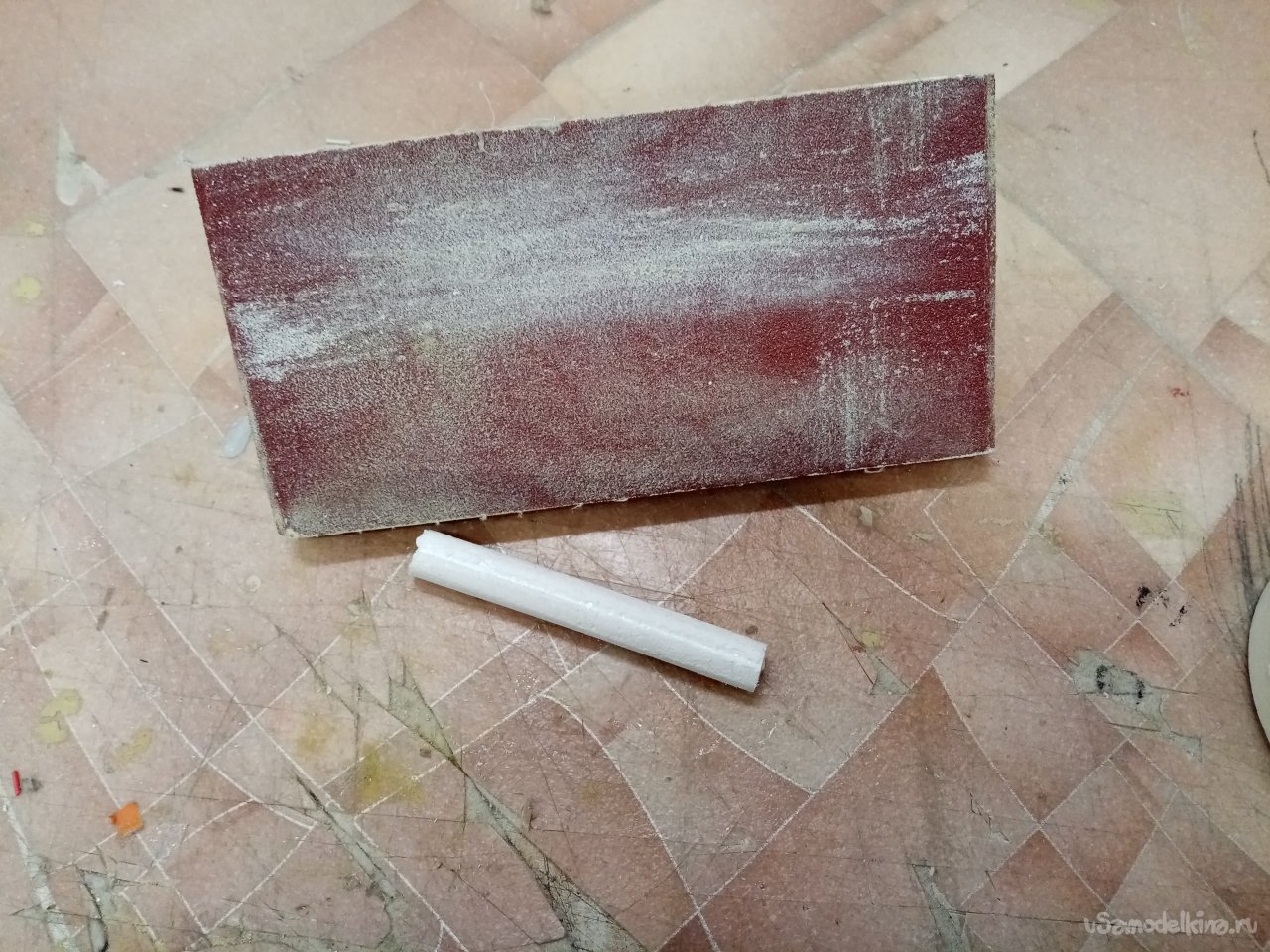 Нужно удалить небольшой участок расщепленной хвостовой балки. Оборачиваю кончики повреждений малярным скотчем. Предохраняю от дальнейшего расщепления при ремонте. Решил внутри балки установить пластиковую трубочку. Также закрепить небольшой бандаж в внешней стороны соединения. Аккуратно отрезаю расщепленные участки по минимуму. Мне нужен чистый вариант стыка поврежденной трубочки. Под скотчем есть еще намного расщепленного материала. Его буду заклеивать по описанному выше способу. Из пенопласта вырезаю цилиндрик по внутреннему диаметру хвостовой балки. Для гладкости немного обрабатываю шкуркой.