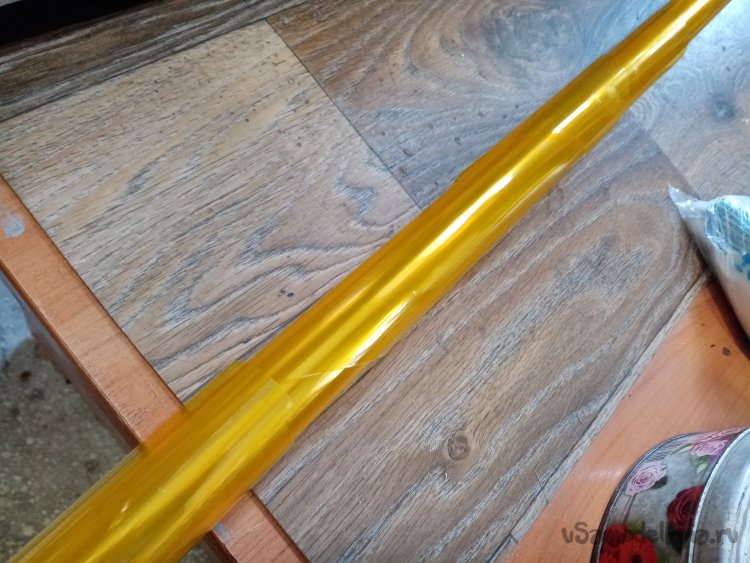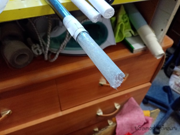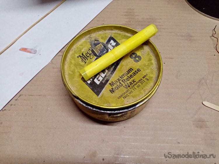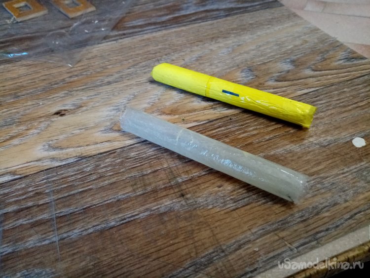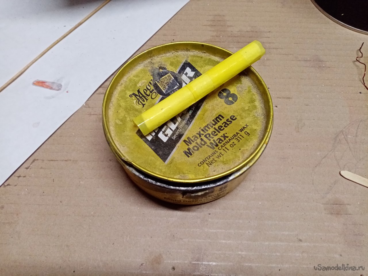 Оклеиваю упаковочным скотчем. Для полной гарантии примеряю цилиндрик по месту. Он должен быть на микрон меньше. С учетом стеклопластика. На трубочку наношу разделительный воск, три слоя.