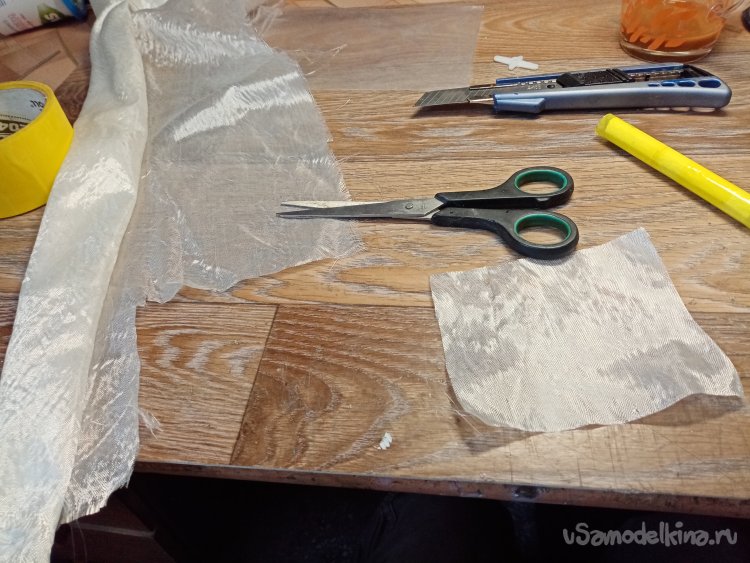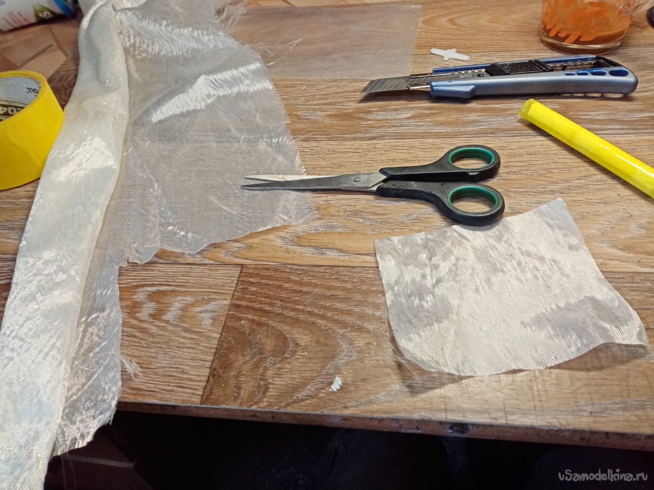 По простой формуле определяю длину окружности нужного цилиндрика. Вырезаю из тонкой стеклоткани 30 грамм весом за метр квадратный, заготовку на некоторое количество слоев.