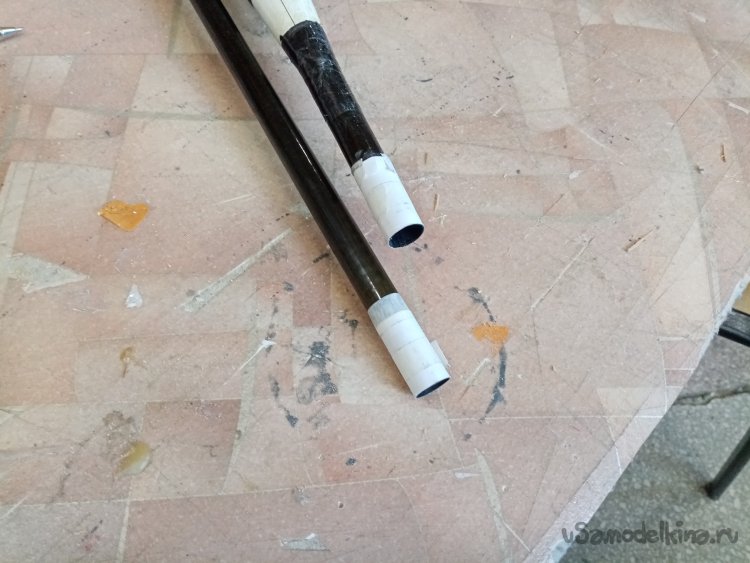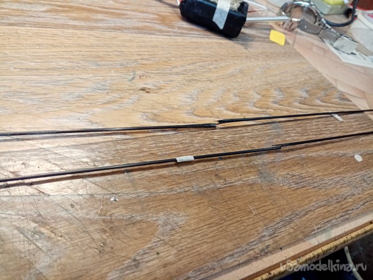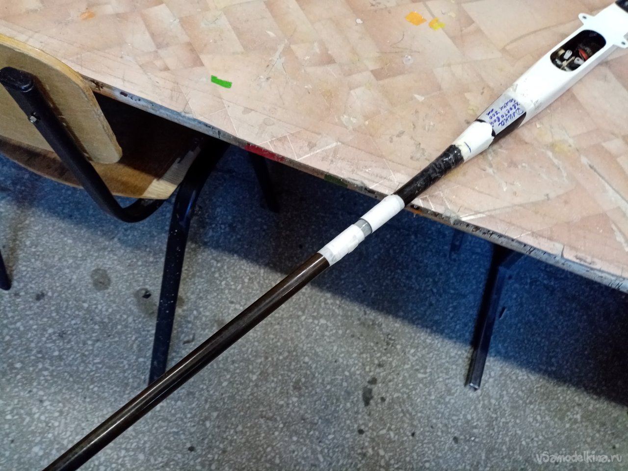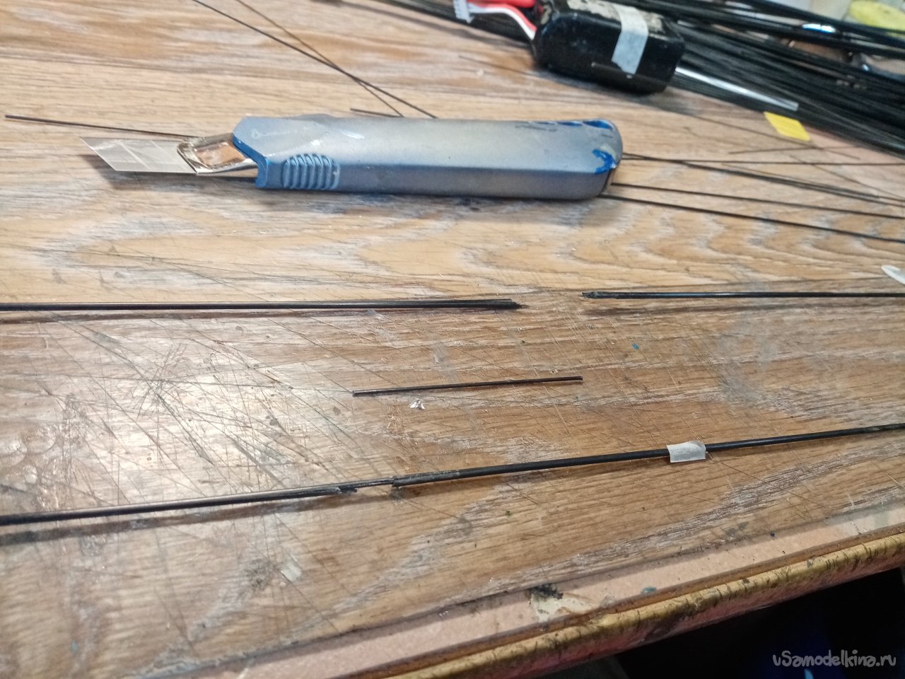 Из запасов выбираю карбоновый прутик подходящего диаметра. Его буду вклеивать внутрь трубочки тяги. Отрезал расщепленные концы и приготовил все для вклейки.