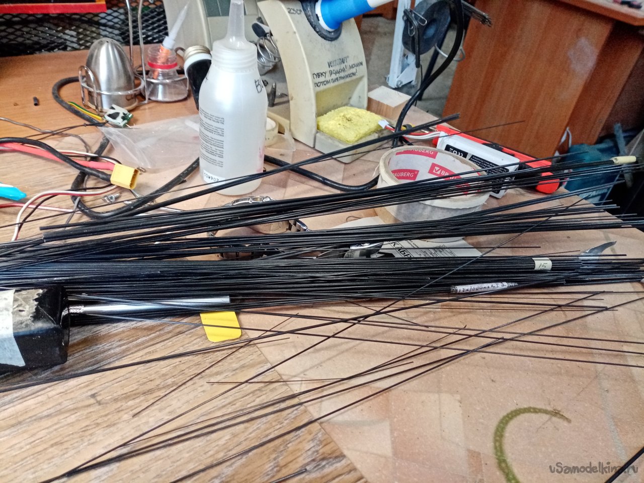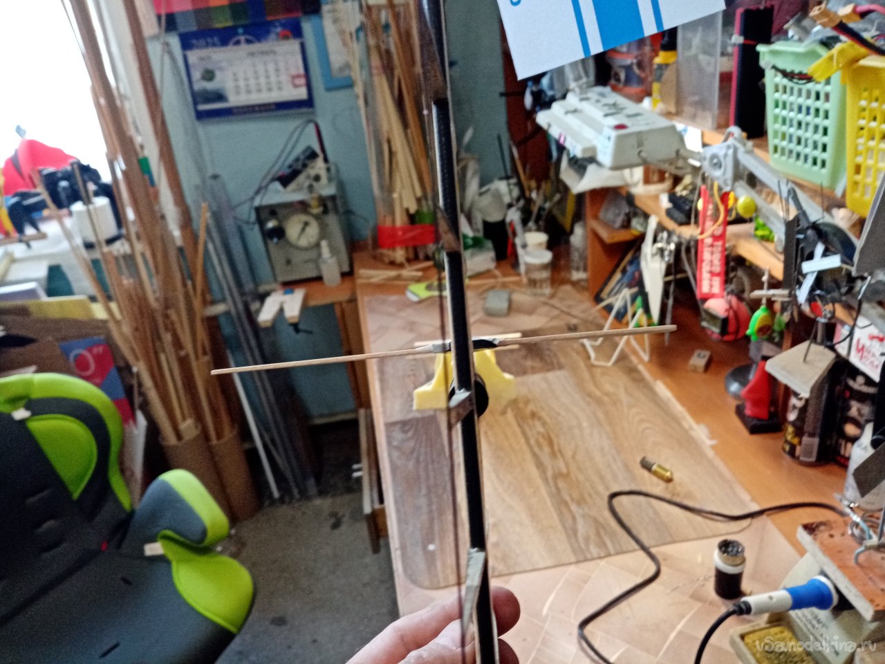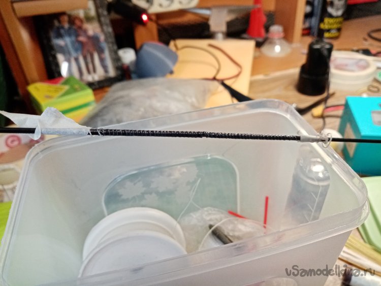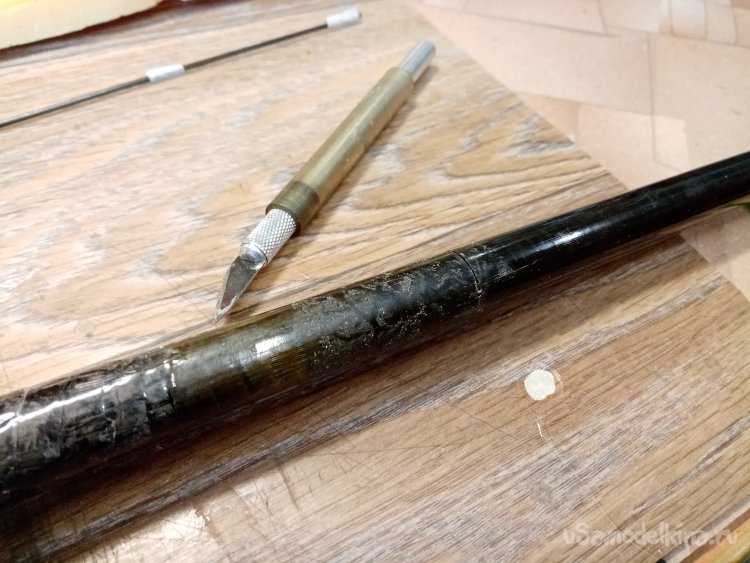 Из запасов выбираю карбоновый прутик подходящего диаметра. Его буду вклеивать внутрь трубочки тяги. Отрезал расщепленные концы и приготовил все для вклейки.