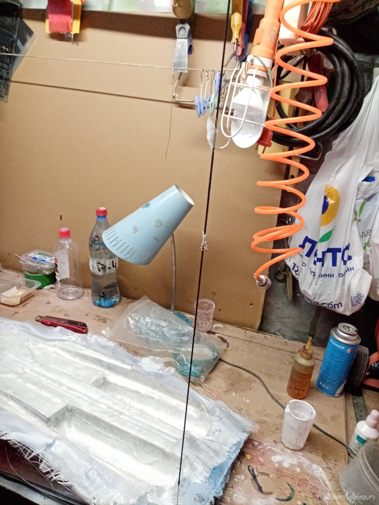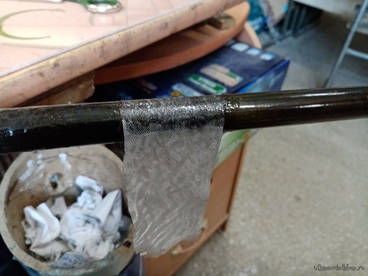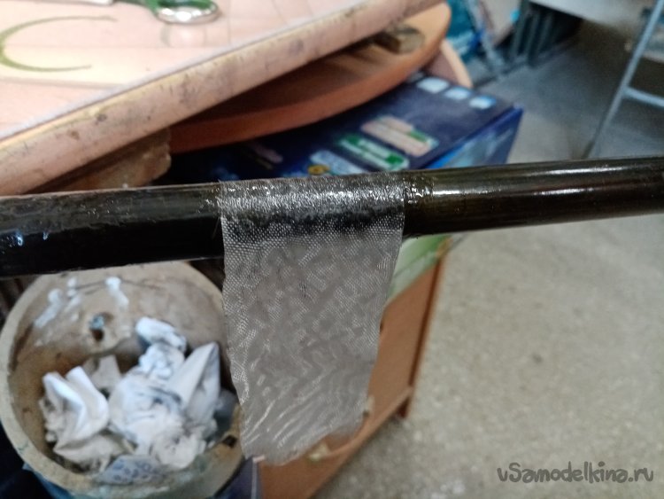 Следующим этапом наложение парочки слоев стеклоткани на внешнюю сторону балки не только в районе склейки, но и немного дальше, где есть остатки трещин. Внешнюю сторону балки потру немного шкуркой для лучшей пропитки смолой.