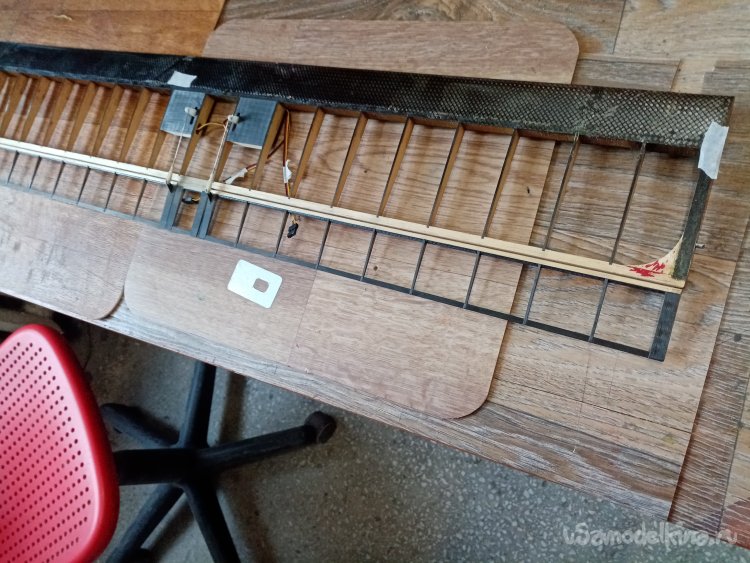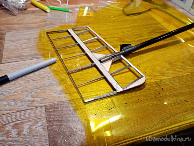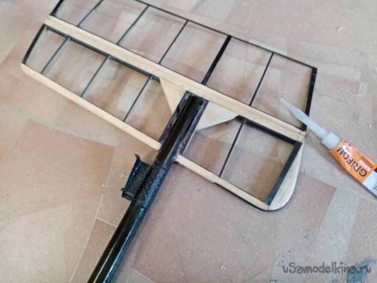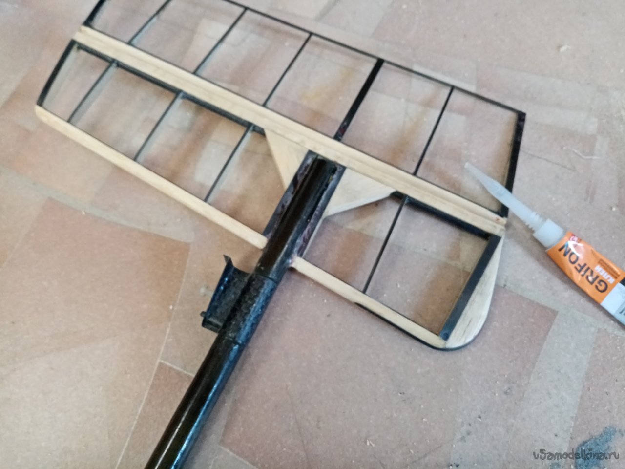Соединяю хвостовую балку насухо. Просто так склеить этот элемент не получится. Нужно изготовить стапель для фиксации всех элементов и нормального взаимного позиционирования.