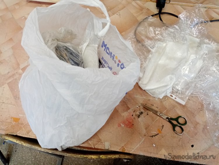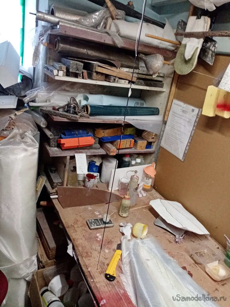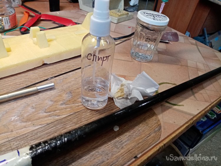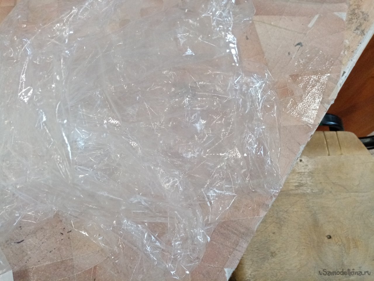 Развожу десять грамм смолы в пластиковом стаканчике. Нужно пропитать тонкую ткань. В качестве основы и подкладки использую кусочек подложки под рекламную пленку оракал. К ней смола не пристает. Проливаю стеклоткань некоторым количеством смолы, накрываю пленкой и по пленке разгоняю смолу по ткани шпателем. При таком приеме появляется возможность выгнать лишнюю смолу по краям. Если хочется немного перфекционизма можно кусочек стеклоткани обложить по краям салфетками, куда и впитаются излишки смолы. Главная трудность при таком способе, это отделение ткани от подложки и пленки. Но достаточно отделить один слой подложки и можно прикладывать край пропитанной ткани на нужное место и постепенно отеля намотать на мой цилиндрик. Что и сделал конечно с некоторыми проблемами. Почему пошел на такие заморочки? Нужно минимальный вес связующего. Не сильно увеличивать массу хвостовой балки. Поскольку планер изготовлен на пределе. Все просчитано, двигать агрегаты при коррекции центра тяжести просто некуда.
