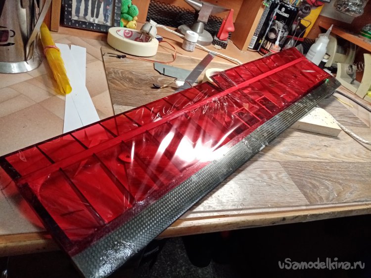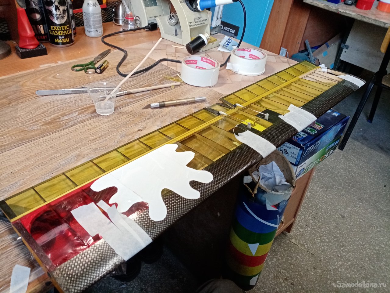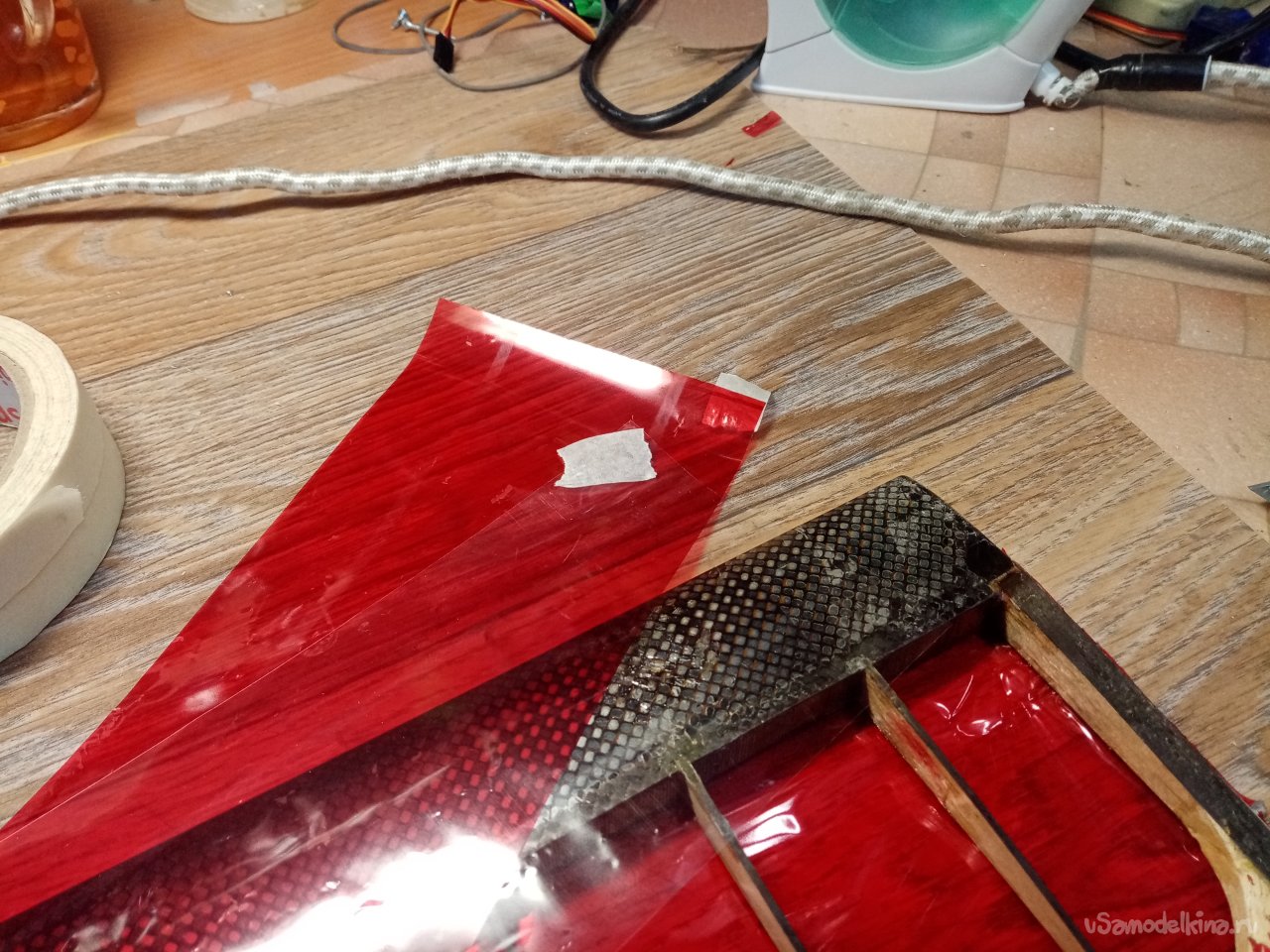 Красной пленки, к сожалению, нет для оклейки рудера. Зато есть отличная прозрачная желтая пленка.