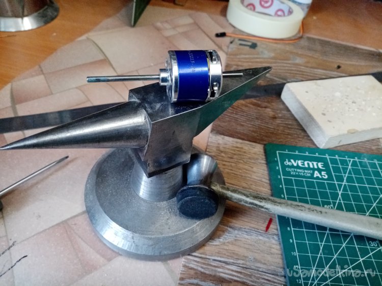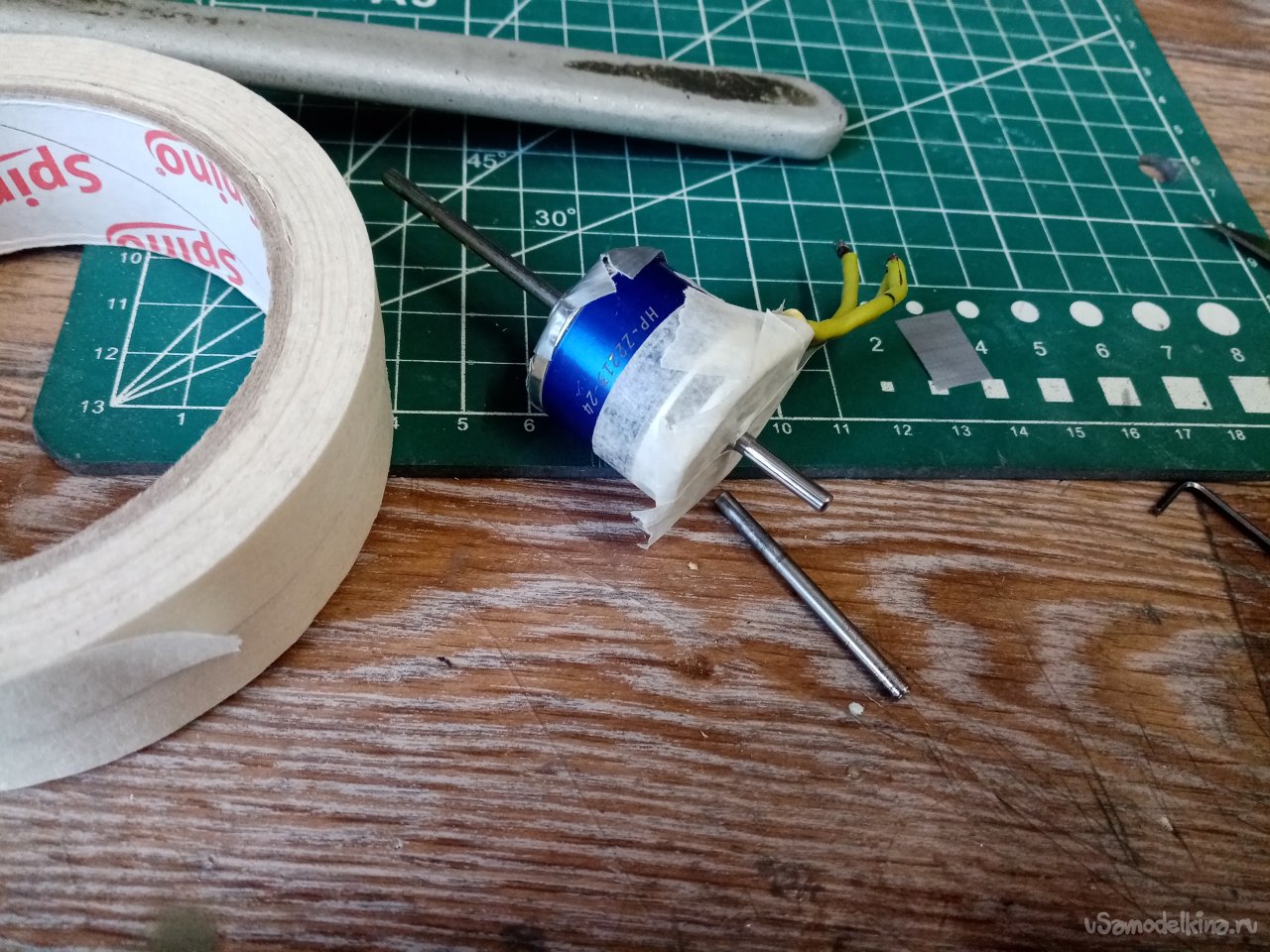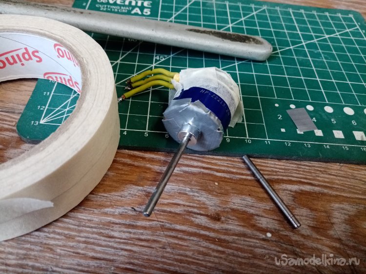 Стандартного вала толщиной в 3,17мм у меня нет. Ох уж эта дюймовая система отсчета! Нахожу подходящий по диаметру прутик и устанавливаю в двигатель. Закрепляю винтами. Нужно отрезать лишнее. Заклеиваю все отверстия двигателя малярным скотчем. Чтобы не попала металлическая стружка на магниты. И отрезаю лишнее болгаркой. Вал закаленный поставил, однако.