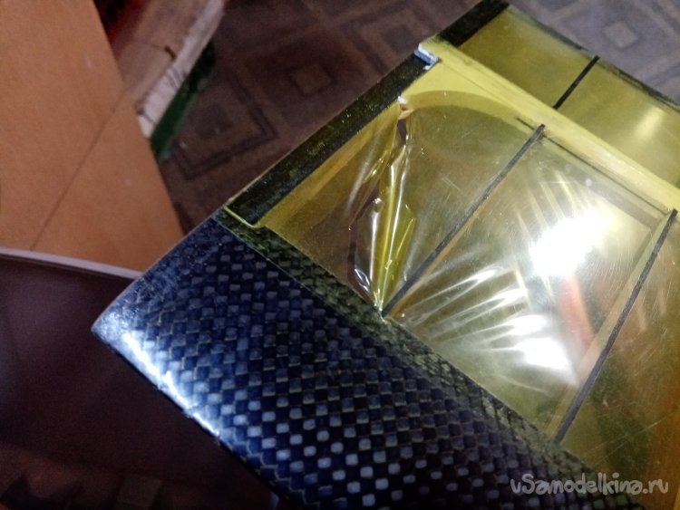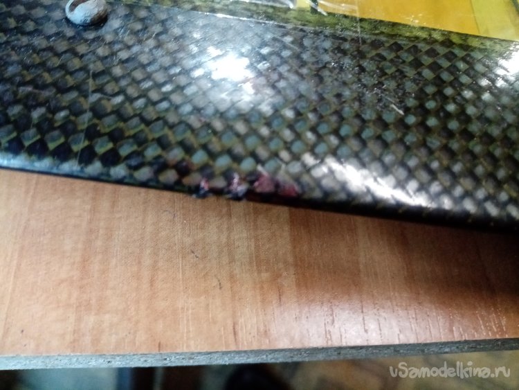 Очень осторожно снимаю пленку с руля направления. Циакрином склеиваю небольшие повреждения.
